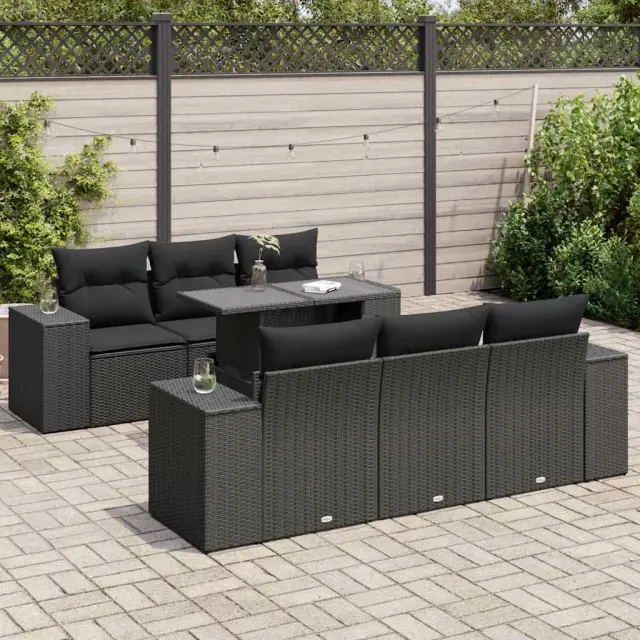 Ta vrtna sedežna garnitura je popoln dodatek za vaše dvorišče, teraso ali verando, saj zagotavlja udoben in vabljiv prostor za klepet z družino in prijatelji ali preprosto za sprostitev in uživanje na prostem. Trpežen material: PE ratan, znan tudi kot poli ratan, je močan sintetični material, ki ne potrebuje vzdrževanja in je videti kot naravni ratan. Je lahek, enostaven za čiščenje in se zaradi svoje vzdržljivosti in odpornosti na vremenske vplive pogosto uporablja za zunanje pohištvo.Funkcija shranjevanja z vodoodporno torbo: Vrtno pohištvo ima pod sedežem prostor za shranjevanje, opremljen z vodoodporno torbo za shranjevanje blazin, igrač in drugih stvari. Notranjo torbo je mogoče varno pritrditi na zunanje pohištvo s kavljem in zanko za večjo stabilnost.Nastavljiva mizna plošča: Z dvigom mizne plošče lahko mizo povišate, s čimer se zunanja klubska mizica spremeni v jedilno mizo. Popolna je za sprejemanje gostov ali uživanje v obrokih na prostem.Prevleko je mogoče odstraniti in oprati: Te sedežne blazine imajo odstranljive prevleke za lažje pranje in vzdrževanje.Modularna zasnova: Ta komplet zunanjega pohištva ima modularno zasnovo, zaradi česar je popolnoma prilagodljiv in enostaven za premikanje, tako da lahko zunanjo garnituro postavite kakor koli želite. Dobro je vedeti:Če želite, da vaše zunanje pohištvo ostane lepo, vam priporočamo, da ga zaščitite z vodoodporno prevleko.Dimenzije vodoodporne vreče: 55 x 53 x 34 cm (D x Š x V)Maksimalna nosilnost (na sedež): 110 kgUV-odpornoPlastične nastavljive nogePotrebno sestavljanje: DaKotni sedež:Barva: ČrnaMaterial: PE ratan, jeklen okvir s prašnim premazomDimenzije: 83 x 62 x 69 cm (Š x G x V)Velikost sedeža: 55 x 55 cm (Š x G)Višina sedeža od tal (brez blazine): 37 cmVišina naslonjal za roke od tal: 55 cmŠirina naslona za roke: 27,5 cmSrednji sedež:Barva: ČrnaMaterial: PE ratan, jeklen okvir s prašnim premazomDimenzije: 55 x 62 x 69 cm (Š x G x V)Velikost sedeža: 55 x 55 cm (Š x G)Višina sedeža od tal (brez blazine): 37 cmMiza:Barva: ČrnaMaterial: PE ratan, jeklo s prašnim premazom, kaljeno stekloDimenzije: 100 x 55 x 44/73 cm (D x Š x V)Blazina:Barva: ČrnaMaterial prevleke: Tkanina (100 % poliester)Polnilo sedežne blazine: PenaPolnilo hrbtne blazine: bombažna vlaknaDimenzije sedežne blazine: 55 x 55 x 3 cm (Š x G x D)Dimenzije hrbtne blazine: 55 x 45 x 13 cm (D x Š x D)Paket vsebuje:1 x Vrtna miza4 x Kotni sedež s funkcijo shranjevanja z vodoodporno vrečo2 x Srednji kavč s funkcijo shranjevanja z vodoodporno vrečo6 x Blazina za hrbet6 x Sedežna blazina s snemljivo pralno prevleko 3326736
