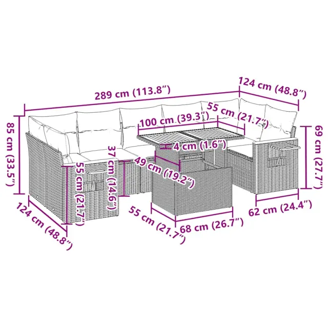 Ta vrtna sedežna garnitura je popoln dodatek za vaše dvorišče, teraso ali verando, saj zagotavlja udoben in vabljiv prostor za klepet z družino in prijatelji ali preprosto za sprostitev in uživanje na prostem.Trpežen material: PE ratan, znan tudi kot poli ratan, je močan sintetični material, ki ne potrebuje vzdrževanja in je videti kot naravni ratan. Je lahek, enostaven za čiščenje in se zaradi svoje vzdržljivosti in odpornosti na vremenske vplive pogosto uporablja za zunanje pohištvo.Funkcija shranjevanja z vodoodporno vrečo: Vsak vrtni sedež ima prostor za shranjevanje pod sedežem, skupaj z vodoodporno vrečo za shranjevanje blazin, igrač in drugih predmetov. Notranje vreče imajo zgornjo prevleko in jih je mogoče s pomočjo primenjal varno pritrditi na sedeže za dodatno varnost.Priročna stranska mizica: To zunanje pohištvo ima zložljivo stransko mizico s plinsko vzmetjo, ki zagotavlja priročen prostor za shranjevanje vaših potrebščin na dosegu roke.Prevleko je mogoče odstraniti in oprati: Te sedežne blazine imajo odstranljive prevleke za lažje pranje in vzdrževanje.Modularna zasnova: Ta komplet zunanjega pohištva ima modularno zasnovo, zaradi česar je popolnoma prilagodljiv in enostaven za premikanje, tako da lahko zunanjo garnituro postavite kakor koli želite.Dobro je vedeti:Če želite, da vaše zunanje pohištvo ostane lepo, vam priporočamo, da ga zaščitite z vodoodporno prevleko.Največja dovoljena teža (na sedež): 110 kgUV-odpornoPlastične nastavljive nogePotrebno sestavljanje: DaKotni sedež:Barva: BežMaterial: PE ratan, jeklen okvir s prašnim premazomDimenzije: 62 x 62 x 69 cm (Š x G x V)Velikost sedeža: 55 x 55 cm (Š x G)Višina sedeža od tal (brez blazine): 37 cmSrednji sedež:Barva: BežMaterial: PE ratan, jeklen okvir s prašnim premazomDimenzije: 55 x 62 x 69 cm (Š x G x V)Velikost sedeža: 55 x 55 cm (Š x G)Višina sedeža od tal (brez blazine): 37 cmKotni sedež z naslonom za roke iz akacijevega lesa:Barva: BežMaterial: PE ratan, prašno premazano jeklo, trden akacijev les z oljnim premazomDimenzije: 62 x 62 x 69 cm (Š x G x V)Velikost sedeža: 55 x 55 cm (Š x G)Višina sedeža od tal (brez blazine): 37 cmVišina naslonjal za roke od tal: 55 cmŠirina naslonjala za roke: 6 cmVelikost stranske mizice: 24,5 x 23,5 cm (D × Š)Miza:Barva: BežMaterial: PE ratan, prašno premazano jeklo, trden akacijev les z oljnim premazomDimenzije: 100 x 55 x 44/73 cm (D x Š x V)Blazina:Barva: Kremno belaMaterial prevleke: Tkanina (100 % poliester)Polnilo sedežne blazine: PenaPolnilo hrbtne blazine: bombažna vlaknaDimenzije sedežne blazine: 55 x 55 x 3 cm (Š x G x D)Dimenzije hrbtne blazine: 55 x 45 x 13 cm (D x Š x D)Paket vsebuje:1 x Vrtna miza2 x Kotni kavč s funkcijo shranjevanja z vodoodporno vrečo2 x Kotni sedež z naslonom za roke iz akacije s funkcijo shranjevanja z vodoodporno torbo3 x Srednji kavč s funkcijo shranjevanja z vodoodporno vrečo7 x Sedežna blazina s snemljivo in pralno prevleko9 x Blazina za hrbet 3327572