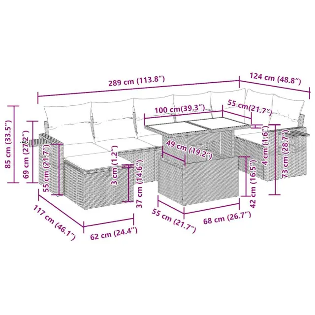 Ta vrtna sedežna garnitura je popoln dodatek za vaše dvorišče, teraso ali verando, saj zagotavlja udoben in vabljiv prostor za klepet z družino in prijatelji ali preprosto za sprostitev in uživanje na prostem.Trpežen material: PE ratan, znan tudi kot poli ratan, je močan sintetični material, ki ne potrebuje vzdrževanja in je videti kot naravni ratan. Je lahek, enostaven za čiščenje in se zaradi svoje vzdržljivosti in odpornosti na vremenske vplive pogosto uporablja za zunanje pohištvo.Funkcija shranjevanja z vodoodporno vrečo: Vsak vrtni sedež ima prostor za shranjevanje pod sedežem, skupaj z vodoodporno vrečo za shranjevanje blazin, igrač in drugih predmetov. Notranje vreče imajo zgornjo prevleko in jih je mogoče s pomočjo primenjal varno pritrditi na sedeže za dodatno varnost.Priročna stranska mizica: To zunanje pohištvo ima zložljivo stransko mizico s plinsko vzmetjo, ki zagotavlja priročen prostor za shranjevanje vaših potrebščin na dosegu roke.Prevleko je mogoče odstraniti in oprati: Te sedežne blazine imajo odstranljive prevleke za lažje pranje in vzdrževanje.Modularna zasnova: Ta komplet zunanjega pohištva ima modularno zasnovo, zaradi česar je popolnoma prilagodljiv in enostaven za premikanje, tako da lahko zunanjo garnituro postavite kakor koli želite.Dobro je vedeti:Če želite, da vaše zunanje pohištvo ostane lepo, vam priporočamo, da ga zaščitite z vodoodporno prevleko.Največja dovoljena teža (na sedež): 110 kgUV-odpornoPlastične nastavljive nogePotrebno sestavljanje: DaKotni sedež:Barva: BežMaterial: PE ratan, jeklen okvir s prašnim premazomDimenzije: 62 x 62 x 69 cm (Š x G x V)Velikost sedeža: 55 x 55 cm (Š x G)Višina sedeža od tal (brez blazine): 37 cmSrednji sedež:Barva: BežMaterial: PE ratan, jeklen okvir s prašnim premazomDimenzije: 55 x 62 x 69 cm (Š x G x V)Velikost sedeža: 55 x 55 cm (Š x G)Višina sedeža od tal (brez blazine): 37 cmStolček:Barva: BežMaterial: PE ratan, jeklen okvir s prašnim premazomDimenzije: 55 x 55 x 37 cm (Š x G x V)Kotni sedež s naslonom za roke iz ratanaBarva: BežMaterial: PE ratan, jeklen okvir s prašnim premazomDimenzije: 62 x 62 x 69 cm (Š x G x V)Velikost sedeža: 55 x 55 cm (Š x G)Višina sedeža od tal (brez blazine): 37 cmVišina naslonjal za roke od tal: 55 cmŠirina naslonjala za roke: 6 cmVelikost stranske mizice: 25 x 23 cm (D x Š)Miza:Barva: ČrnaMaterial: PE ratan, jeklo s prašnim premazom, kaljeno stekloDimenzije: 100 x 55 x 44/73 cm (D x Š x V)Blazina:Barva: Kremno belaMaterial prevleke: Tkanina (100 % poliester)Polnilo sedežne blazine: PenaPolnilo hrbtne blazine: bombažna vlaknaDimenzije sedežne blazine: 55 x 55 x 3 cm (Š x G x D)Dimenzije hrbtne blazine: 55 x 45 x 13 cm (D x Š x D)Paket vsebuje:1 x Vrtna miza1 x Kotni kavč s funkcijo shranjevanja z vodoodporno vrečo2 x Kotni sedež z naslonom za roke iz ratana s funkcijo shranjevanja z vodoodporno torbo3 x Srednji kavč s funkcijo shranjevanja z vodoodporno vrečo1 x Stolček s funkcijo shranjevanja z vodoodporno vrečo7 x Sedežna blazina s snemljivo in pralno prevleko7 x Hrbtna blazina 3327868