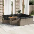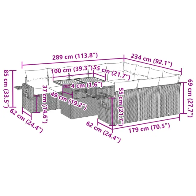 Ta vrtna sedežna garnitura je popoln dodatek za vaše dvorišče, teraso ali verando, saj zagotavlja udoben in vabljiv prostor za klepet z družino in prijatelji ali preprosto za sprostitev in uživanje na prostem. Trpežen material: PE ratan, znan tudi kot poli ratan, je močan sintetični material, ki ne potrebuje vzdrževanja in je videti kot naravni ratan. Je lahek, enostaven za čiščenje in se zaradi svoje vzdržljivosti in odpornosti na vremenske vplive pogosto uporablja za zunanje pohištvo.Funkcija shranjevanja z vodoodporno torbo: Vrtno pohištvo ima pod sedežem prostor za shranjevanje, opremljen z vodoodporno torbo za shranjevanje blazin, igrač in drugih stvari. Notranjo torbo je mogoče varno pritrditi na zunanje pohištvo s kavljem in zanko za večjo stabilnost.Nastavljiva mizna plošča: Z dvigom mizne plošče lahko mizo povišate, s čimer se zunanja klubska mizica spremeni v jedilno mizo. Popolna je za sprejemanje gostov ali uživanje v obrokih na prostem.Prevleko je mogoče odstraniti in oprati: Te sedežne blazine imajo odstranljive prevleke za lažje pranje in vzdrževanje.Modularna zasnova: Ta komplet zunanjega pohištva ima modularno zasnovo, zaradi česar je popolnoma prilagodljiv in enostaven za premikanje, tako da lahko zunanjo garnituro postavite kakor koli želite. Dobro je vedeti:Če želite, da vaše zunanje pohištvo ostane lepo, vam priporočamo, da ga zaščitite z vodoodporno prevleko.Dimenzije vodoodporne vreče: 55 x 53 x 34 cm (D x Š x V)Maksimalna nosilnost (na sedež): 110 kgUV-odpornoPlastične nastavljive nogePotrebno sestavljanje: DaKotni sedež:Barva: SivaMaterial: PE ratan, jeklen okvir s prašnim premazomDimenzije: 62 x 62 x 69 cm (Š x G x V)Velikost sedeža: 55 x 55 cm (Š x G)Višina sedeža od tal (brez blazine): 37 cmKotni sedež s naslonom za roke iz ratana:Barva: SivaMaterial: PE ratan, jeklen okvir s prašnim premazomDimenzije: 62 x 62 x 69 cm (Š x G x V)Velikost sedeža: 55 x 55 cm (Š x G)Višina sedeža od tal (brez blazine): 37 cmVišina naslonjal za roke od tal: 55 cmŠirina naslonjala za roke: 6 cmVelikost stranske mizice: 25 x 23 cm (D x Š)Srednji sedež:Barva: SivaMaterial: PE ratan, jeklen okvir s prašnim premazomDimenzije: 55 x 62 x 69 cm (Š x G x V)Velikost sedeža: 55 x 55 cm (Š x G)Višina sedeža od tal (brez blazine): 37 cmMiza:Barva: SivaMaterial: PE ratan, prašno premazano jeklo, trden akacijev les z oljnim premazomDimenzije: 100 x 55 x 44/73 cm (D x Š x V)Blazina:Barva: Temno sivaMaterial prevleke: Tkanina (100 % poliester)Polnilo sedežne blazine: PenaPolnilo hrbtne blazine: bombažna vlaknaDimenzije sedežne blazine: 55 x 55 x 3 cm (Š x G x D)Dimenzije hrbtne blazine: 55 x 45 x 13 cm (D x Š x D)Paket vsebuje:1 x Vrtna miza2 x Kotni kavč s funkcijo shranjevanja z vodoodporno vrečo2 x Kotni sedež z naslonom za roke iz ratana s funkcijo shranjevanja z vodoodporno torbo6 x Srednji kavč s funkcijo shranjevanja z vodoodporno vrečo12 x Blazina za hrbet10 x Sedežna blazina s snemljivo in pralno prevleko 3327203