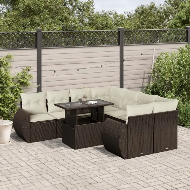 Ta vrtna sedežna garnitura je popoln dodatek za vaše dvorišče, teraso ali verando, saj zagotavlja udoben in vabljiv prostor za klepet z družino in prijatelji ali preprosto za sprostitev in uživanje na prostem. Vzdržljiv material: PE ratan, znan tudi kot poli ratan, je močan sintetični material, ki zahteva malo vzdrževanja in je videti kot naravni ratan. Je lahek, enostaven za čiščenje in se zaradi svoje vzdržljivosti in odpornosti na vremenske vplive pogosto uporablja za zunanje pohištvo.Nastavljiva mizna plošča: Z dvigom mizne plošče lahko mizo povišate, s čimer se zunanja klubska mizica spremeni v jedilno mizo. Popolna je za sprejemanje gostov ali uživanje v obrokih na prostem.Udobno sedenje: To zunanje pohištvo z debelo oblazinjenimi blazinami zagotavlja udobno sedenje.Prevleko je mogoče odstraniti in oprati: Te sedežne blazine imajo odstranljive prevleke za lažje pranje in vzdrževanje.Modularna zasnova: Ta komplet zunanjega pohištva ima modularno zasnovo, zaradi česar je popolnoma prilagodljiv in enostaven za premikanje, tako da lahko zunanjo garnituro postavite kakor koli želite. Dobro je vedeti:Če želite, da vaše zunanje pohištvo ostane lepo, vam priporočamo, da ga zaščitite z vodoodporno prevleko.Maksimalna nosilnost (na sedež): 110 kgUV-odpornoPotrebno sestavljanje: DaKotni sedež:Barva: RjavaMaterial: PE ratan, jeklen okvir s prašnim premazomDimenzije: 62 x 62 x 69 cm (Š x G x V)Velikost sedeža: 55 x 55 cm (Š x G)Višina sedeža, merjena od tal: 37 cmSrednji sedež:Barva: RjavaMaterial: PE ratan, jeklen okvir s prašnim premazomDimenzije: 55 x 62 x 69 cm (Š x G x V)Velikost sedeža: 55 x 55 cm (Š x G)Višina sedeža, merjena od tal: 37 cmKavč z naslonjali za roke:Barva: RjavaMaterial: PE ratan, jeklen okvir s prašnim premazomDimenzije: 70 x 62 x 69 cm (Š x G x V)Velikost sedeža: 55 x 55 cm (Š x G)Višina sedeža, merjena od tal: 37 cmVišina naslonjal za roke od tal: 55 cmMiza:Barva: RjavaMaterial: PE ratan, jeklo s prašnim premazom, kaljeno stekloDimenzije: 100 x 55 x 44/73 cm (D x Š x V)Blazina:Barva: Kremno bela Material prevleke: Tkanina (100 % poliester)Polnilo sedežne blazine: PenaPolnilo hrbtne blazine: bombažna vlaknaDimenzije sedežne blazine: 55 x 55 x 3 cm (Š x G x D)Dimenzije hrbtne blazine: 55 x 45 x 13 cm (D x Š x D)Paket vsebuje:2 x Kotni sedež4 x Srednji sedež2 x Kavč z naslonjali za roke1 x Vrtna miza10 x Blazina za hrbet8 x Sedežna blazina s snemljivo in pralno prevleko 3268433