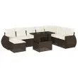 Ta vrtna sedežna garnitura je popoln dodatek za vaše dvorišče, teraso ali verando, saj zagotavlja udoben in vabljiv prostor za klepet z družino in prijatelji ali preprosto za sprostitev in uživanje na prostem. Vzdržljiv material: PE ratan, znan tudi kot poli ratan, je močan sintetični material, ki zahteva malo vzdrževanja in je videti kot naravni ratan. Je lahek, enostaven za čiščenje in se zaradi svoje vzdržljivosti in odpornosti na vremenske vplive pogosto uporablja za zunanje pohištvo.Nastavljiva mizna plošča: Z dvigom mizne plošče lahko mizo povišate, s čimer se zunanja klubska mizica spremeni v jedilno mizo. Popolna je za sprejemanje gostov ali uživanje v obrokih na prostem.Udobno sedenje: To zunanje pohištvo z debelo oblazinjenimi blazinami zagotavlja udobno sedenje.Prevleko je mogoče odstraniti in oprati: Te sedežne blazine imajo odstranljive prevleke za lažje pranje in vzdrževanje.Modularna zasnova: Ta komplet zunanjega pohištva ima modularno zasnovo, zaradi česar je popolnoma prilagodljiv in enostaven za premikanje, tako da lahko zunanjo garnituro postavite kakor koli želite. Dobro je vedeti:Če želite, da vaše zunanje pohištvo ostane lepo, vam priporočamo, da ga zaščitite z vodoodporno prevleko.Maksimalna nosilnost (na sedež): 110 kgUV-odpornoPotrebno sestavljanje: DaKotni sedež:Barva: RjavaMaterial: PE ratan, jeklen okvir s prašnim premazomDimenzije: 62 x 62 x 69 cm (Š x G x V)Velikost sedeža: 55 x 55 cm (Š x G)Višina sedeža, merjena od tal: 37 cmSrednji sedež:Barva: RjavaMaterial: PE ratan, jeklen okvir s prašnim premazomDimenzije: 55 x 62 x 69 cm (Š x G x V)Velikost sedeža: 55 x 55 cm (Š x G)Višina sedeža, merjena od tal: 37 cmKavč z naslonjali za roke:Barva: RjavaMaterial: PE ratan, jeklen okvir s prašnim premazomDimenzije: 70 x 62 x 69 cm (Š x G x V)Velikost sedeža: 55 x 55 cm (Š x G)Višina sedeža, merjena od tal: 37 cmVišina naslonjal za roke od tal: 55 cmStolček za noge:Barva: RjavaMaterial: PE ratan, jeklen okvir s prašnim premazomDimenzije: 55 x 55 x 37 cm (Š x G x V)Velikost sedeža: 55 x 55 cm (Š x G)Višina sedeža, merjena od tal: 37 cmMiza:Barva: RjavaMaterial: PE ratan, jeklo s prašnim premazom, kaljeno stekloDimenzije: 100 x 55 x 44/73 cm (D x Š x V)Blazina:Barva: Kremno bela Material prevleke: Tkanina (100 % poliester)Polnilo sedežne blazine: PenaPolnilo hrbtne blazine: bombažna vlaknaDimenzije sedežne blazine: 55 x 55 x 3 cm (Š x G x D)Dimenzije hrbtne blazine: 55 x 45 x 13 cm (D x Š x D)Paket vsebuje:1 x Kotni sedež4 x Srednji sedež2 x Kavč z naslonjali za roke1 x Stolček za noge1 x Vrtna miza8 x Blazina za hrbet8 x Sedežna blazina s snemljivo in pralno prevleko 3268733