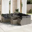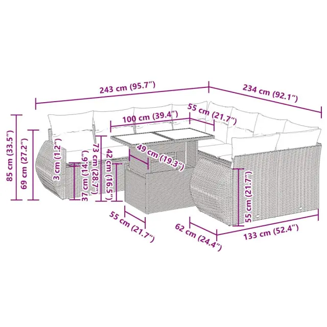 Ta vrtna sedežna garnitura je popoln dodatek za vaše dvorišče, teraso ali verando, saj zagotavlja udoben in vabljiv prostor za klepet z družino in prijatelji ali preprosto za sprostitev in uživanje na prostem. Trpežen material: PE ratan, znan tudi kot poli ratan, je močan sintetični material, ki ne potrebuje vzdrževanja in je videti kot naravni ratan. Je lahek, enostaven za čiščenje in se zaradi svoje vzdržljivosti in odpornosti na vremenske vplive pogosto uporablja za zunanje pohištvo.Funkcija shranjevanja z vodoodporno vrečo: Vsak vrtni sedež ima pod sedežem prostor za shranjevanje, opremljen z vodoodporno vrečo za shranjevanje blazin, igrač in drugih predmetov. Notranja torba ima zgornji pokrov in jo je mogoče varno pritrditi na sedež s kavljem in zanko za večjo stabilnost.Nastavljiva mizna plošča: Z dvigom mizne plošče lahko mizo povišate, s čimer se zunanja klubska mizica spremeni v jedilno mizo. Popolna je za sprejemanje gostov ali uživanje v obrokih na prostem.Prevleko je mogoče odstraniti in oprati: Te sedežne blazine imajo odstranljive prevleke za lažje pranje in vzdrževanje.Robusten in stabilen okvir: Jeklen okvir s prašnim premazom je močan, stabilen, trpežen ter odporen na korozijo in slabe vremenske razmere, kar zagotavlja dolgotrajno delovanje. Dobro je vedeti:Če želite, da vaše zunanje pohištvo ostane lepo, vam priporočamo, da ga zaščitite z vodoodporno prevleko.Dimenzije vodoodporne vreče: 55 x 53 x 34 cm (D x Š x V)Največja dovoljena teža (na sedež): 110 kgUV-odpornoPlastične nastavljive nogePotrebno sestavljanje: DaSrednji sedež:Barva: SivaMaterial: PE ratan, jeklen okvir s prašnim premazomDimenzije: 55 x 62 x 69 cm (Š x G x V)Velikost sedeža: 55 x 55 cm (Š x G)Višina sedeža od tal (brez blazine): 37 cmKotni sedež:Barva: SivaMaterial: PE ratan, jeklen okvir s prašnim premazomDimenzije: 62 x 62 x 69 cm (Š x G x V)Velikost sedeža: 55 x 55 cm (Š x G)Višina sedeža od tal (brez blazine): 37 cmKavč z naslonjali za roke:Barva: SivaMaterial: PE ratan, jeklen okvir s prašnim premazomDimenzije: 71 x 62 x 69 cm (Š x G x V)Velikost sedeža: 55 x 55 cm (Š x G)Višina sedeža od tal (brez blazine): 37 cmVišina naslonjal za roke od tal: 55 cmMiza:Barva: SivaMaterial: PE ratan, jeklo s prašnim premazom, kaljeno stekloDimenzije: 100 x 55 x 44/73 cm (D x Š x V)Blazina:Barva: Temno sivaMaterial prevleke: Tkanina (100 % poliester)Polnilo sedežne blazine: PenaPolnilo hrbtne blazine: bombažna vlaknaDimenzije sedežne blazine: 55 x 55 x 3 cm (Š x G x D)Dimenzije hrbtne blazine: 55 x 45 x 13 cm (D x Š x D)Paket vsebuje:4 x Srednji kavč s funkcijo shranjevanja z vodoodporno vrečo2 x Kotni kavč s funkcijo shranjevanja z vodoodporno vrečo2 x Kavč s funkcijo shranjevanja z vodoodporno vrečo1 x Miza10 x Blazina za hrbet8 x Sedežna blazina s snemljivo in pralno prevleko 3326611