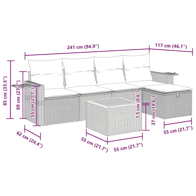 Ta vrtna sedežna garnitura je popoln dodatek za vaše dvorišče, teraso ali verando, saj zagotavlja udoben in vabljiv prostor za klepet z družino in prijatelji ali preprosto za sprostitev in uživanje na prostem. Trpežen material: PE ratan, znan tudi kot poli ratan, je močan sintetični material, ki ne potrebuje vzdrževanja in je videti kot naravni ratan. Je lahek, enostaven za čiščenje in se zaradi svoje vzdržljivosti in odpornosti na vremenske vplive pogosto uporablja za zunanje pohištvo.Funkcija shranjevanja z vodoodporno torbo: Vrtno pohištvo ima pod sedežem prostor za shranjevanje, opremljen z vodoodporno torbo za shranjevanje blazin, igrač in drugih stvari. Notranjo torbo je mogoče varno pritrditi na zunanje pohištvo s kavljem in zanko za večjo stabilnost.Vsestranski stolček za noge: Stolček je vsestransko uporaben, saj služi kot udoben naslon za noge, ko ležite na kavču, ali kot dodaten sedež na vrtu.Prevleko je mogoče odstraniti in oprati: Te sedežne blazine imajo odstranljive prevleke za lažje pranje in vzdrževanje.Modularna zasnova: Ta komplet zunanjega pohištva ima modularno zasnovo, zaradi česar je popolnoma prilagodljiv in enostaven za premikanje, tako da lahko zunanjo garnituro postavite kakor koli želite. Dobro je vedeti:Če želite, da vaše zunanje pohištvo ostane lepo, vam priporočamo, da ga zaščitite z vodoodporno prevleko.Dimenzije vodoodporne vreče: 55 x 53 x 34 cm (D x Š x V)Največja dovoljena teža (na sedež): 110 kgUV-odpornoPlastične nastavljive nogePotrebno sestavljanje: DaKavč z naslonjali za roke:Barva: BežMaterial: PE ratan, jeklen okvir s prašnim premazomDimenzije: 62 x 62 x 69 cm (Š x G x V)Velikost sedeža: 55 x 55 cm (Š x G)Višina sedeža od tal (brez blazine): 37 cmVišina naslonjal za roke od tal: 55 cmŠirina naslonjala za roke: 6 cmVelikost stranske mizice: 25 x 23 cm (D x Š)Srednji sedež:Barva: BežMaterial: PE ratan, jeklen okvir s prašnim premazomDimenzije: 55 x 62 x 69 cm (Š x G x V)Velikost sedeža: 55 x 55 cm (Š x G)Višina sedeža od tal (brez blazine): 37 cmStolček za noge:Barva: BežMaterial: PE ratan, jeklen okvir s prašnim premazomDimenzije: 55 x 55 x 37 cm (Š x G x V)Vrtna miza:Barva: Bež in rjavaMaterial: PE ratan, prašno premazano jeklo, trden akacijev les z oljnim premazomDimenzije: 55 x 55 x 37 cm (Š x G x V)Blazina:Barva: Svetlo sivaMaterial prevleke: Tkanina (100 % poliester)Polnilo sedežne blazine: PenaPolnilo hrbtne blazine: bombažna vlaknaDimenzije sedežne blazine: 55 x 55 x 3 cm (Š x G x D)Dimenzije hrbtne blazine: 55 x 45 x 13 cm (D x Š x D) Paket vsebuje:2 x Kavč s funkcijo shranjevanja z vodoodporno vrečo2 x Srednji kavč s funkcijo shranjevanja z vodoodporno vrečo1 x Stolček s funkcijo shranjevanja1 x Vrtna miza6 x Blazina za hrbet5 x Sedežna blazina s snemljivo pralno prevleko 3325811