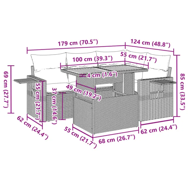 Ta vrtna sedežna garnitura je popoln dodatek za vaše dvorišče, teraso ali verando, saj zagotavlja udoben in vabljiv prostor za klepet z družino in prijatelji ali preprosto za sprostitev in uživanje na prostem. Trpežen material: PE ratan, znan tudi kot poli ratan, je močan sintetični material, ki ne potrebuje vzdrževanja in je videti kot naravni ratan. Je lahek, enostaven za čiščenje in se zaradi svoje vzdržljivosti in odpornosti na vremenske vplive pogosto uporablja za zunanje pohištvo.Funkcija shranjevanja z vodoodporno torbo: Vrtno pohištvo ima pod sedežem prostor za shranjevanje, opremljen z vodoodporno torbo za shranjevanje blazin, igrač in drugih stvari. Notranjo torbo je mogoče varno pritrditi na zunanje pohištvo s kavljem in zanko za večjo stabilnost.Nastavljiva mizna plošča: Z dvigom mizne plošče lahko mizo povišate, s čimer se zunanja klubska mizica spremeni v jedilno mizo. Popolna je za sprejemanje gostov ali uživanje v obrokih na prostem.Prevleko je mogoče odstraniti in oprati: Te sedežne blazine imajo odstranljive prevleke za lažje pranje in vzdrževanje.Modularna zasnova: Ta komplet zunanjega pohištva ima modularno zasnovo, zaradi česar je popolnoma prilagodljiv in enostaven za premikanje, tako da lahko zunanjo garnituro postavite kakor koli želite. Dobro je vedeti:Če želite, da vaše zunanje pohištvo ostane lepo, vam priporočamo, da ga zaščitite z vodoodporno prevleko.Dimenzije vodoodporne vreče: 55 x 53 x 34 cm (D x Š x V)Maksimalna nosilnost (na sedež): 110 kgUV-odpornoPlastične nastavljive nogePotrebno sestavljanje: DaKotni sedež:Barva: BežMaterial: PE ratan, jeklen okvir s prašnim premazomDimenzije: 62 x 62 x 69 cm (Š x G x V)Velikost sedeža: 55 x 55 cm (Š x G)Višina sedeža od tal (brez blazine): 37 cmKotni sedež s naslonom za roke iz ratana:Barva: BežMaterial: PE ratan, jeklen okvir s prašnim premazomDimenzije: 62 x 62 x 69 cm (Š x G x V)Velikost sedeža: 55 x 55 cm (Š x G)Višina sedeža od tal (brez blazine): 37 cmVišina naslonjal za roke od tal: 55 cmŠirina naslonjala za roke: 6 cmVelikost stranske mizice: 25 x 23 cm (D x Š)Srednji sedež:Barva: BežMaterial: PE ratan, jeklen okvir s prašnim premazomDimenzije: 55 x 62 x 69 cm (Š x G x V)Velikost sedeža: 55 x 55 cm (Š x G)Višina sedeža od tal (brez blazine): 37 cmMiza:Barva: BežMaterial: PE ratan, prašno premazano jeklo, trden akacijev les z oljnim premazomDimenzije: 100 x 55 x 44/73 cm (D x Š x V)Blazina:Barva: Kremno belaMaterial prevleke: Tkanina (100 % poliester)Polnilo sedežne blazine: PenaPolnilo hrbtne blazine: bombažna vlaknaDimenzije sedežne blazine: 55 x 55 x 3 cm (Š x G x D)Dimenzije hrbtne blazine: 55 x 45 x 13 cm (D x Š x D)Paket vsebuje:1 x Vrtna miza1 x Kotni kavč s funkcijo shranjevanja z vodoodporno vrečo2 x Kotni sedež z naslonom za roke iz ratana s funkcijo shranjevanja z vodoodporno torbo1 x Srednji kavč s funkcijo shranjevanja z vodoodporno vrečo5 x Blazina za hrbet4 x Sedežna blazina s snemljivo in pralno prevleko 3327145