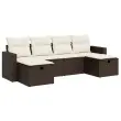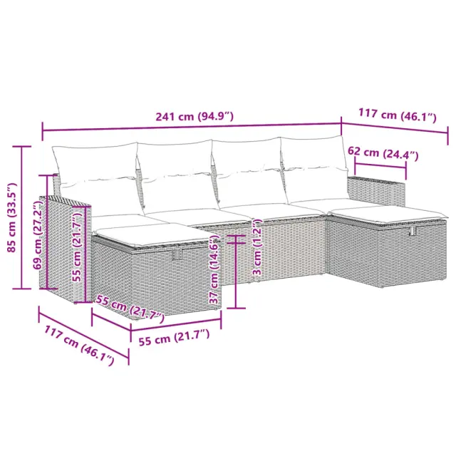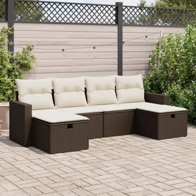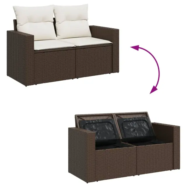 Ta vrtna sedežna garnitura je popoln dodatek za vaše dvorišče, teraso ali verando, saj zagotavlja udoben in vabljiv prostor za klepet z družino in prijatelji ali preprosto za sprostitev in uživanje na prostem. Trpežen material: PE ratan, znan tudi kot poli ratan, je močan sintetični material, ki ne potrebuje vzdrževanja in je videti kot naravni ratan. Je lahek, enostaven za čiščenje in se zaradi svoje vzdržljivosti in odpornosti na vremenske vplive pogosto uporablja za zunanje pohištvo.Funkcija shranjevanja z vodoodporno torbo: Vrtno pohištvo ima pod sedežem prostor za shranjevanje, opremljen z vodoodporno torbo za shranjevanje blazin, igrač in drugih stvari. Notranjo torbo je mogoče varno pritrditi na zunanje pohištvo s kavljem in zanko za večjo stabilnost.Vsestranski stolček za noge: Stolček je vsestransko uporaben, saj služi kot udoben naslon za noge, ko ležite na kavču, ali kot dodaten sedež na vrtu.Prevleko je mogoče odstraniti in oprati: Te sedežne blazine imajo odstranljive prevleke za lažje pranje in vzdrževanje.Modularna zasnova: Ta komplet zunanjega pohištva ima modularno zasnovo, zaradi česar je popolnoma prilagodljiv in enostaven za premikanje, tako da lahko zunanjo garnituro postavite kakor koli želite. Dobro je vedeti:Če želite, da vaše zunanje pohištvo ostane lepo, vam priporočamo, da ga zaščitite z vodoodporno prevleko.Dimenzije vodoodporne vreče: 55 x 53 x 34 cm (D x Š x V)Največja dovoljena teža (na sedež): 110 kgUV-odpornoPlastične nastavljive nogePotrebno sestavljanje: DaKavč z naslonjali za roke:Barva: RjavaMaterial: PE ratan, jeklen okvir s prašnim premazomDimenzije: 65,5 x 62 x 69 cm (Š x G x V)Velikost sedeža: 55 x 55 cm (Š x G)Višina sedeža od tal (brez blazine): 37 cmVišina naslonjal za roke od tal: 55 cmŠirina naslonjala za roke: 10 cmSrednji sedež:Barva: RjavaMaterial: PE ratan, jeklen okvir s prašnim premazomDimenzije: 55 x 62 x 69 cm (Š x G x V)Velikost sedeža: 55 x 55 cm (Š x G)Višina sedeža od tal (brez blazine): 37 cmStolček za noge:Barva: RjavaMaterial: PE ratan, jeklen okvir s prašnim premazomDimenzije: 55 x 55 x 37 cm (Š x G x V)Blazina:Barva: Kremno belaMaterial prevleke: Tkanina (100 % poliester)Polnilo sedežne blazine: PenaPolnilo hrbtne blazine: bombažna vlaknaDimenzije sedežne blazine: 55 x 55 x 3 cm (Š x G x D)Dimenzije hrbtne blazine: 55 x 45 x 13 cm (D x Š x D)Paket vsebuje:2 x Kavč s funkcijo shranjevanja z vodoodporno vrečo2 x Srednji kavč s funkcijo shranjevanja z vodoodporno vrečo2 x Stolček s funkcijo shranjevanja4 x Blazina za hrbet6 x Sedežna blazina s snemljivo pralno prevleko 3325429