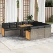 Ta vrtna sedežna garnitura je popoln dodatek za vaše dvorišče, teraso ali verando, saj zagotavlja udoben in vabljiv prostor za klepet z družino in prijatelji ali preprosto za sprostitev in uživanje na prostem.Trpežen material: PE ratan, znan tudi kot poli ratan, je močan sintetični material, ki ne potrebuje vzdrževanja in je videti kot naravni ratan. Je lahek, enostaven za čiščenje in se zaradi svoje vzdržljivosti in odpornosti na vremenske vplive pogosto uporablja za zunanje pohištvo.Funkcija shranjevanja z vodoodporno vrečo: Vsak vrtni sedež ima prostor za shranjevanje pod sedežem, skupaj z vodoodporno vrečo za shranjevanje blazin, igrač in drugih predmetov. Notranje vreče imajo zgornjo prevleko in jih je mogoče s pomočjo primenjal varno pritrditi na sedeže za dodatno varnost.Prevleko je mogoče odstraniti in oprati: Te sedežne blazine imajo odstranljive prevleke za lažje pranje in vzdrževanje.Modularna zasnova: Ta komplet zunanjega pohištva ima modularno zasnovo, zaradi česar je popolnoma prilagodljiv in enostaven za premikanje, tako da lahko zunanjo garnituro postavite kakor koli želite.Dobro je vedeti:Če želite, da vaše zunanje pohištvo ostane lepo, vam priporočamo, da ga zaščitite z vodoodporno prevleko.Največja dovoljena teža (na sedež): 110 kgUV-odpornoPlastične nastavljive nogePotrebno sestavljanje: DaKotni sedež:Barva: SivaMaterial: PE ratan, jeklen okvir s prašnim premazomDimenzije: 62 x 62 x 69 cm (Š x G x V)Velikost sedeža: 55 x 55 cm (Š x G)Višina sedeža od tal (brez blazine): 37 cmSrednji sedež:Barva: SivaMaterial: PE ratan, jeklen okvir s prašnim premazomDimenzije: 55 x 62 x 69 cm (Š x G x V)Velikost sedeža: 55 x 55 cm (Š x G)Višina sedeža od tal (brez blazine): 37 cmKotni sedež z naslonom za roke iz akacijevega lesa:Barva: SivaMaterial: PE ratan, prašno premazano jeklo, trden akacijev les z oljnim premazomDimenzije: 59 x 62 x 69 cm (Š x G x V)Velikost sedeža: 55 x 55 cm (Š x G)Višina sedeža od tal (brez blazine): 37 cmVišina naslonjal za roke od tal: 55 cmMiza:Material: PE ratan, prašno premazano jeklo, trden akacijev les z oljnim premazomDimenzije: 100 x 55 x 44/73 cm (D x Š x V)Srednji sedež:Barva: SivaMaterial: PE ratan, jeklen okvir s prašnim premazomDimenzije: 55 x 62 x 69 cm (Š x G x V)Velikost sedeža: 55 x 55 cm (Š x G)Višina sedeža od tal (brez blazine): 37 cmBlazina:Barva: Temno sivaMaterial prevleke: Tkanina (100 % poliester)Polnilo sedežne blazine: PenaPolnilo hrbtne blazine: bombažna vlaknaDimenzije sedežne blazine: 55 x 55 x 3 cm (Š x G x D)Dimenzije hrbtne blazine: 55 x 45 x 13 cm (D x Š x D)Paket vsebuje:1 x Vrtna miza4 x Kotni sedež s funkcijo shranjevanja z vodoodporno vrečo6 x Srednji kavč s funkcijo shranjevanja z vodoodporno vrečo10 x Sedežna blazina s snemljivo in pralno prevleko12 x Blazina za hrbet 3327763
