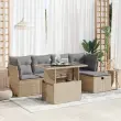 Ta vrtna sedežna garnitura je popoln dodatek za vaše dvorišče, teraso ali verando, saj zagotavlja udoben in vabljiv prostor za klepet z družino in prijatelji ali preprosto za sprostitev in uživanje na prostem. Trpežen material: PE ratan, znan tudi kot poli ratan, je močan sintetični material, ki ne potrebuje vzdrževanja in je videti kot naravni ratan. Je lahek, enostaven za čiščenje in se zaradi svoje vzdržljivosti in odpornosti na vremenske vplive pogosto uporablja za zunanje pohištvo.Funkcija shranjevanja z vodoodporno vrečo: Vsak vrtni sedež ima pod sedežem prostor za shranjevanje, opremljen z vodoodporno vrečo za shranjevanje blazin, igrač in drugih predmetov. Notranja torba ima zgornji pokrov in jo je mogoče varno pritrditi na sedež s kavljem in zanko za večjo stabilnost.Nastavljiva mizna plošča: Z dvigom mizne plošče lahko mizo povišate, s čimer se zunanja klubska mizica spremeni v jedilno mizo. Popolna je za sprejemanje gostov ali uživanje v obrokih na prostem.Vsestranski stolček za noge: Stolček je vsestransko uporaben, saj služi kot udoben naslon za noge, ko ležite na kavču, ali kot dodaten sedež na vrtu.Prevleko je mogoče odstraniti in oprati: Te sedežne blazine imajo odstranljive prevleke za lažje pranje in vzdrževanje.Robusten in stabilen okvir: Jeklen okvir s prašnim premazom je močan, stabilen, trpežen ter odporen na korozijo in slabe vremenske razmere, kar zagotavlja dolgotrajno delovanje. Dobro je vedeti:Če želite, da vaše zunanje pohištvo ostane lepo, vam priporočamo, da ga zaščitite z vodoodporno prevleko.Dimenzije vodoodporne vreče: 55 x 53 x 34 cm (D x Š x V)Največja dovoljena teža (na sedež): 110 kgUV-odpornoPlastične nastavljive nogePotrebno sestavljanje: DaSrednji sedež:Barva: BežMaterial: PE ratan, jeklen okvir s prašnim premazomDimenzije: 55 x 62 x 69 cm (Š x G x V)Velikost sedeža: 55 x 55 cm (Š x G)Višina sedeža od tal (brez blazine): 37 cmKotni sedež:Barva: BežMaterial: PE ratan, jeklen okvir s prašnim premazomDimenzije: 62 x 62 x 69 cm (Š x G x V)Velikost sedeža: 55 x 55 cm (Š x G)Višina sedeža od tal (brez blazine): 37 cmStolček za noge:Barva: BežMaterial: PE ratan, jeklen okvir s prašnim premazomDimenzije: 55 x 55 x 37 cm (Š x G x V)Miza:Barva: BežMaterial: PE ratan, jeklo s prašnim premazom, kaljeno stekloDimenzije: 100 x 55 x 44/73 cm (D x Š x V)Blazina:Barva: Svetlo sivaMaterial prevleke: Tkanina (100 % poliester)Polnilo sedežne blazine: PenaPolnilo hrbtne blazine: bombažna vlaknaDimenzije sedežne blazine: 55 x 55 x 3 cm (Š x G x D)Dimenzije hrbtne blazine: 55 x 45 x 13 cm (D x Š x D)Paket vsebuje:2 x Srednji kavč s funkcijo shranjevanja z vodoodporno vrečo2 x Kotni kavč s funkcijo shranjevanja z vodoodporno vrečo1 x Stolček za noge s funkcijo shranjevanja z vodoodporno vrečo1 x Miza6 x Blazina za hrbet5 x Sedežna blazina s snemljivo pralno prevleko 3326140