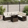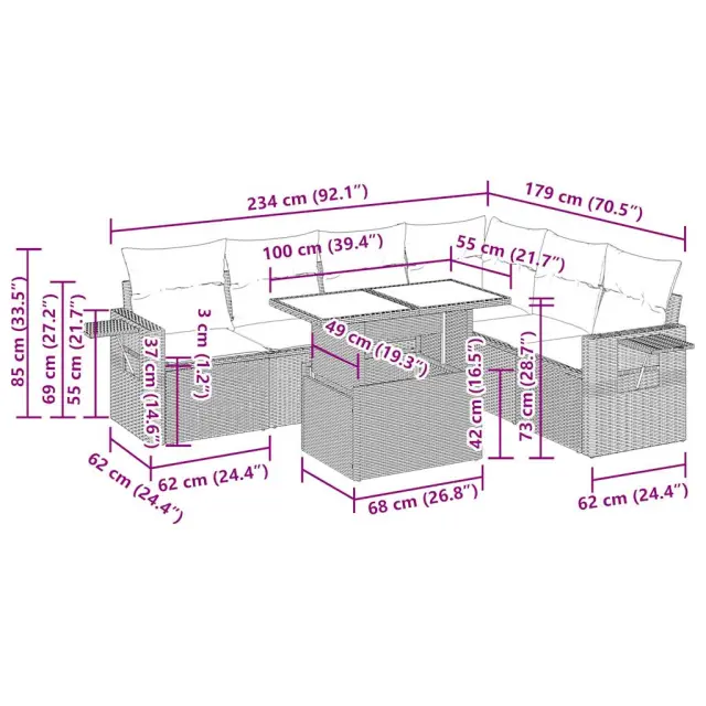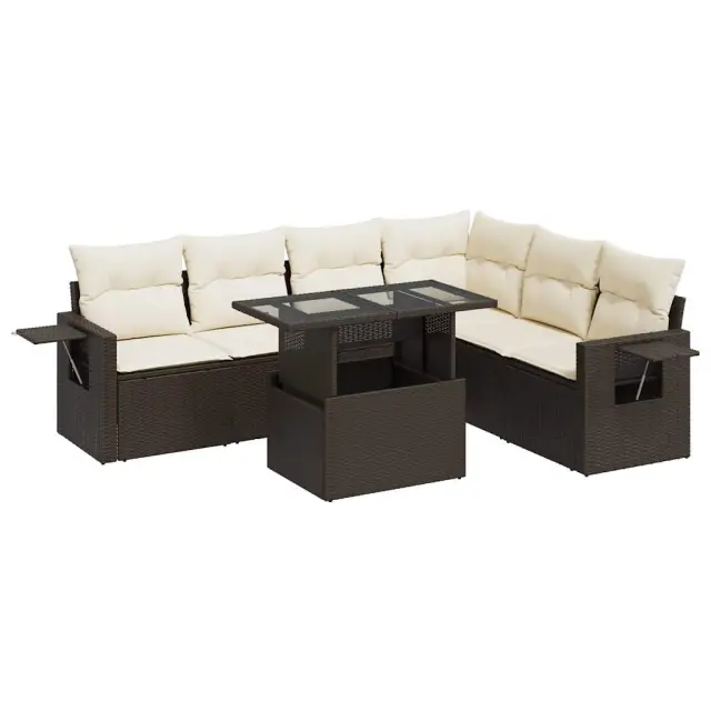 Ta vrtna sedežna garnitura je popoln dodatek za vaše dvorišče, teraso ali verando, saj zagotavlja udoben in vabljiv prostor za klepet z družino in prijatelji ali preprosto za sprostitev in uživanje na prostem. Trpežen material: PE ratan, znan tudi kot poli ratan, je močan sintetični material, ki ne potrebuje vzdrževanja in je videti kot naravni ratan. Je lahek, enostaven za čiščenje in se zaradi svoje vzdržljivosti in odpornosti na vremenske vplive pogosto uporablja za zunanje pohištvo.Funkcija shranjevanja z vodoodporno vrečo: Vsak vrtni sedež ima pod sedežem prostor za shranjevanje, opremljen z vodoodporno vrečo za shranjevanje blazin, igrač in drugih predmetov. Notranja torba ima zgornji pokrov in jo je mogoče varno pritrditi na sedež s kavljem in zanko za večjo stabilnost.Nastavljiva mizna plošča: Z dvigom mizne plošče lahko mizo povišate, s čimer se zunanja klubska mizica spremeni v jedilno mizo. Popolna je za sprejemanje gostov ali uživanje v obrokih na prostem.Prevleko je mogoče odstraniti in oprati: Te sedežne blazine imajo odstranljive prevleke za lažje pranje in vzdrževanje.Robusten in stabilen okvir: Jeklen okvir s prašnim premazom je močan, stabilen, trpežen ter odporen na korozijo in slabe vremenske razmere, kar zagotavlja dolgotrajno delovanje. Dobro je vedeti:Če želite, da vaše zunanje pohištvo ostane lepo, vam priporočamo, da ga zaščitite z vodoodporno prevleko.Dimenzije vodoodporne vreče: 55 x 53 x 34 cm (D x Š x V)Največja dovoljena teža (na sedež): 110 kgUV-odpornoPlastične nastavljive nogePotrebno sestavljanje: DaSrednji sedež:Barva: RjavaMaterial: PE ratan, jeklen okvir s prašnim premazomDimenzije: 55 x 62 x 69 cm (Š x G x V)Velikost sedeža: 55 x 55 cm (Š x G)Višina sedeža od tal (brez blazine): 37 cmKotni sedež:Barva: RjavaMaterial: PE ratan, jeklen okvir s prašnim premazomDimenzije: 62 x 62 x 69 cm (Š x G x V)Velikost sedeža: 55 x 55 cm (Š x G)Višina sedeža od tal (brez blazine): 37 cmKavč z naslonjali za roke:Barva: RjavaMaterial: PE ratan, jeklen okvir s prašnim premazomDimenzije: 62 x 62 x 69 cm (Š x G x V)Velikost sedeža: 55 x 55 cm (Š x G)Višina sedeža od tal (brez blazine): 37 cmVišina naslonjal za roke od tal: 55 cmMiza:Barva: RjavaMaterial: PE ratan, jeklo s prašnim premazom, kaljeno stekloDimenzije: 100 x 55 x 44/73 cm (D x Š x V)Blazina:Barva: Kremno belaMaterial prevleke: Tkanina (100 % poliester)Polnilo sedežne blazine: PenaPolnilo hrbtne blazine: bombažna vlaknaDimenzije sedežne blazine: 55 x 55 x 3 cm (Š x G x D)Dimenzije hrbtne blazine: 55 x 45 x 13 cm (D x Š x D)Paket vsebuje:3 x Srednji kavč s funkcijo shranjevanja z vodoodporno vrečo1 x Kotni kavč s funkcijo shranjevanja z vodoodporno vrečo2 x Kavč s funkcijo shranjevanja z vodoodporno vrečo1 x Miza7 x Hrbtna blazina6 x Sedežna blazina s snemljivo pralno prevleko 3326494