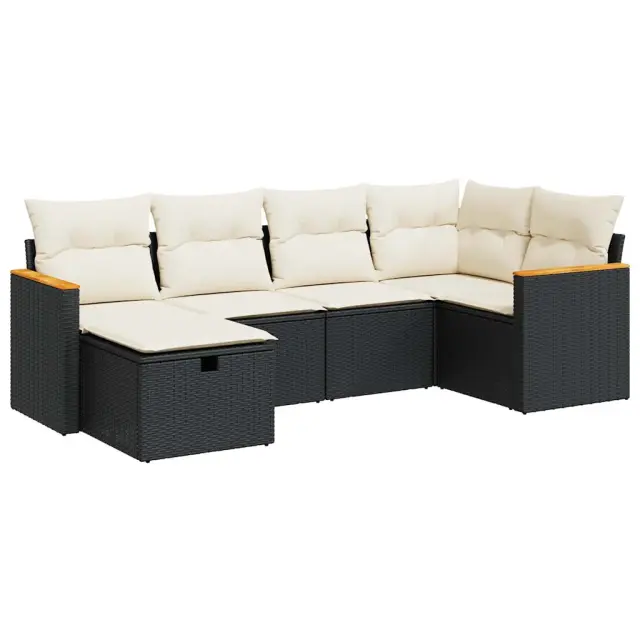 Ta vrtna sedežna garnitura je popoln dodatek za vaše dvorišče, teraso ali verando, saj zagotavlja udoben in vabljiv prostor za klepet z družino in prijatelji ali preprosto za sprostitev in uživanje na prostem. Trpežen material: PE ratan, znan tudi kot poli ratan, je močan sintetični material, ki ne potrebuje vzdrževanja in je videti kot naravni ratan. Je lahek, enostaven za čiščenje in se zaradi svoje vzdržljivosti in odpornosti na vremenske vplive pogosto uporablja za zunanje pohištvo.Funkcija shranjevanja z vodoodporno torbo: Vrtno pohištvo ima pod sedežem prostor za shranjevanje, opremljen z vodoodporno torbo za shranjevanje blazin, igrač in drugih stvari. Notranjo torbo je mogoče varno pritrditi na zunanje pohištvo s kavljem in zanko za večjo stabilnost.Vsestranski stolček za noge: Stolček je vsestransko uporaben, saj služi kot udoben naslon za noge, ko ležite na kavču, ali kot dodaten sedež na vrtu.Prevleko je mogoče odstraniti in oprati: Te sedežne blazine imajo odstranljive prevleke za lažje pranje in vzdrževanje.Modularna zasnova: Ta komplet zunanjega pohištva ima modularno zasnovo, zaradi česar je popolnoma prilagodljiv in enostaven za premikanje, tako da lahko zunanjo garnituro postavite kakor koli želite. Dobro je vedeti:Če želite, da vaše zunanje pohištvo ostane lepo, vam priporočamo, da ga zaščitite z vodoodporno prevleko.Dimenzije vodoodporne vreče: 55 x 53 x 34 cm (D x Š x V)Največja dovoljena teža (na sedež): 110 kgUV-odpornoPlastične nastavljive nogePotrebno sestavljanje: DaKavč z naslonjali za roke:Barva: ČrnaMaterial: PE ratan, prašno premazano jeklo, trden akacijev les z oljnim premazomDimenzije: 62 x 62 x 69 cm (Š x G x V)Velikost sedeža: 55 x 55 cm (Š x G)Višina sedeža od tal (brez blazine): 37 cmVišina naslonjal za roke od tal: 55 cmKotni sedež:Barva: ČrnaMaterial: PE ratan, jeklen okvir s prašnim premazomDimenzije: 62 x 62 x 69 cm (Š x G x V)Velikost sedeža: 55 x 55 cm (Š x G)Višina sedeža od tal (brez blazine): 37 cmSrednji sedež:Barva: ČrnaMaterial: PE ratan, jeklen okvir s prašnim premazomDimenzije: 55 x 62 x 69 cm (Š x G x V)Velikost sedeža: 55 x 55 cm (Š x G)Višina sedeža od tal (brez blazine): 37 cmStolček za noge:Barva: ČrnaMaterial: PE ratan, jeklen okvir s prašnim premazomDimenzije: 55 x 55 x 37 cm (Š x G x V)Blazina:Barva: Kremno belaMaterial prevleke: Tkanina (100 % poliester)Polnilo sedežne blazine: PenaPolnilo hrbtne blazine: bombažna vlaknaDimenzije sedežne blazine: 55 x 55 x 3 cm (Š x G x D)Dimenzije hrbtne blazine: 55 x 45 x 13 cm (D x Š x D)Paket vsebuje:2 x Kavč s funkcijo shranjevanja z vodoodporno vrečo1 x Kotni kavč s funkcijo shranjevanja z vodoodporno vrečo2 x Srednji kavč s funkcijo shranjevanja z vodoodporno vrečo1 x Stolček s funkcijo shranjevanja6 x Blazina za hrbet6 x Sedežna blazina s snemljivo pralno prevleko 3325913