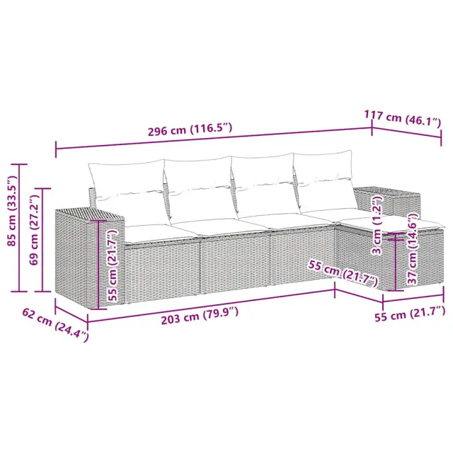 Ta vrtna sedežna garnitura je popoln dodatek za vaše dvorišče, teraso ali verando, saj zagotavlja udoben in vabljiv prostor za klepet z družino in prijatelji ali preprosto za sprostitev in uživanje na prostem. Trpežen material: PE ratan, znan tudi kot poli ratan, je močan sintetični material, ki ne potrebuje vzdrževanja in je videti kot naravni ratan. Je lahek, enostaven za čiščenje in se zaradi svoje vzdržljivosti in odpornosti na vremenske vplive pogosto uporablja za zunanje pohištvo.Funkcija shranjevanja z vodoodporno torbo: Vrtno pohištvo ima pod sedežem prostor za shranjevanje, opremljen z vodoodporno torbo za shranjevanje blazin, igrač in drugih stvari. Notranjo torbo je mogoče varno pritrditi na zunanje pohištvo s kavljem in zanko za večjo stabilnost.Vsestranski stolček za noge: Stolček je vsestransko uporaben, saj služi kot udoben naslon za noge, ko ležite na kavču, ali kot dodaten sedež na vrtu.Prevleko je mogoče odstraniti in oprati: Te sedežne blazine imajo odstranljive prevleke za lažje pranje in vzdrževanje.Modularna zasnova: Ta komplet zunanjega pohištva ima modularno zasnovo, zaradi česar je popolnoma prilagodljiv in enostaven za premikanje, tako da lahko zunanjo garnituro postavite kakor koli želite. Dobro je vedeti:Če želite, da vaše zunanje pohištvo ostane lepo, vam priporočamo, da ga zaščitite z vodoodporno prevleko.Dimenzije vodoodporne vreče: 55 x 53 x 34 cm (D x Š x V)Največja dovoljena teža (na sedež): 110 kgUV-odpornoPlastične nastavljive nogePotrebno sestavljanje: DaKavč z naslonjali za roke:Barva: RjavaMaterial: PE ratan, jeklen okvir s prašnim premazomDimenzije: 93 x 62 x 69 cm (Š x G x V)Velikost sedeža: 55 x 55 cm (Š x G)Višina sedeža od tal (brez blazine): 37 cmVišina naslonjal za roke od tal: 55 cmŠirina naslona za roke: 27,5 cmSrednji sedež:Barva: RjavaMaterial: PE ratan, jeklen okvir s prašnim premazomDimenzije: 55 x 62 x 69 cm (Š x G x V)Velikost sedeža: 55 x 55 cm (Š x G)Višina sedeža od tal (brez blazine): 37 cmStolček za noge:Barva: RjavaMaterial: PE ratan, jeklen okvir s prašnim premazomDimenzije: 55 x 55 x 37 cm (Š x G x V)Blazina:Barva: Kremno belaMaterial prevleke: Tkanina (100 % poliester)Polnilo sedežne blazine: PenaPolnilo hrbtne blazine: bombažna vlaknaDimenzije sedežne blazine: 55 x 55 x 3 cm (Š x G x D)Dimenzije hrbtne blazine: 55 x 45 x 13 cm (D x Š x D) Paket vsebuje:2 x Kavč s funkcijo shranjevanja z vodoodporno vrečo2 x Srednji kavč s funkcijo shranjevanja z vodoodporno vrečo1 x Stolček s funkcijo shranjevanja4 x Blazina za hrbet5 x Sedežna blazina s snemljivo pralno prevleko 3325669