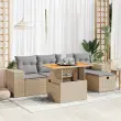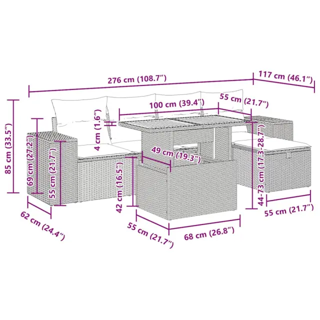 Ta vrtna sedežna garnitura je popoln dodatek za vaše dvorišče, teraso ali verando, saj zagotavlja udoben in vabljiv prostor za klepet z družino in prijatelji ali preprosto za sprostitev in uživanje na prostem.Trpežen material: PE ratan, znan tudi kot poli ratan, je močan sintetični material, ki ne potrebuje vzdrževanja in je videti kot naravni ratan. Je lahek, enostaven za čiščenje in se zaradi svoje vzdržljivosti in odpornosti na vremenske vplive pogosto uporablja za zunanje pohištvo.Funkcija shranjevanja z vodoodporno vrečo: Vsak vrtni sedež ima prostor za shranjevanje pod sedežem, skupaj z vodoodporno vrečo za shranjevanje blazin, igrač in drugih predmetov. Notranje vreče imajo zgornjo prevleko in jih je mogoče s pomočjo primenjal varno pritrditi na sedeže za dodatno varnost.Prevleko je mogoče odstraniti in oprati: Te sedežne blazine imajo odstranljive prevleke za lažje pranje in vzdrževanje.Modularna zasnova: Ta komplet zunanjega pohištva ima modularno zasnovo, zaradi česar je popolnoma prilagodljiv in enostaven za premikanje, tako da lahko zunanjo garnituro postavite kakor koli želite.Dobro je vedeti:Če želite, da vaše zunanje pohištvo ostane lepo, vam priporočamo, da ga zaščitite z vodoodporno prevleko.Dimenzije vodoodporne vreče: 55 x 53 x 34 cm (D x Š x V)Največja dovoljena teža (na sedež): 110 kgUV-odpornoPlastične nastavljive nogePotrebno sestavljanje: DaKotni sedež:Barva: BežMaterial: PE ratan, jeklen okvir s prašnim premazomDimenzije: 62 x 62 x 69 cm (Š x G x V)Velikost sedeža: 55 x 55 cm (Š x G)Višina sedeža od tal (brez blazine): 37 cmKavč z naslonjali za roke:Barva: BežMaterial: PE ratan, jeklen okvir s prašnim premazomDimenzije: 93 x 62 x 69 cm (Š x G x V)Velikost sedeža: 55 x 55 cm (Š x G)Višina sedeža od tal (brez blazine): 37 cmVišina naslonjal za roke od tal: 55 cmŠirina naslona za roke: 27,5 cmStolček za noge:Barva: BežMaterial: PE ratan, jeklen okvir s prašnim premazomDimenzije: 55 x 55 x 37 cm (Š x G x V)Miza:Barva: BežMaterial: PE ratan, prašno premazano jeklo, trden akacijev les z oljnim premazomDimenzije: 100 x 55 x 44/73 cm (D x Š x V)Blazina:Barva: Svetlo sivaMaterial prevleke: Tkanina (100 % poliester)Polnilo sedežne blazine: PenaPolnilo hrbtne blazine: bombažna vlaknaDimenzije sedežne blazine: 55 x 55 x 3 cm (Š x G x D)Dimenzije hrbtne blazine: 55 x 45 x 13 cm (D x Š x D)Paket vsebuje:2 x Kotni kavč s funkcijo shranjevanja z vodoodporno vrečo2 x Kavč s funkcijo shranjevanja z vodoodporno vrečo1 x Stolček za noge s funkcijo shranjevanja z vodoodporno vrečo1 x Miza6 x Blazina za hrbet5 x Sedežna blazina s snemljivo pralno prevleko 3328081