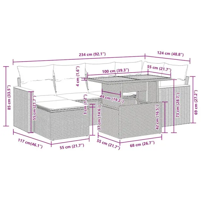 Ta vrtna sedežna garnitura je popoln dodatek za vaše dvorišče, teraso ali verando, saj zagotavlja udoben in vabljiv prostor za klepet z družino in prijatelji ali preprosto za sprostitev in uživanje na prostem.Trpežen material: PE ratan, znan tudi kot poli ratan, je močan sintetični material, ki ne potrebuje vzdrževanja in je videti kot naravni ratan. Je lahek, enostaven za čiščenje in se zaradi svoje vzdržljivosti in odpornosti na vremenske vplive pogosto uporablja za zunanje pohištvo.Funkcija shranjevanja z vodoodporno vrečo: Vsak vrtni sedež ima prostor za shranjevanje pod sedežem, skupaj z vodoodporno vrečo za shranjevanje blazin, igrač in drugih predmetov. Notranje vreče imajo zgornjo prevleko in jih je mogoče s pomočjo primenjal varno pritrditi na sedeže za dodatno varnost.Prevleko je mogoče odstraniti in oprati: Te sedežne blazine imajo odstranljive prevleke za lažje pranje in vzdrževanje.Modularna zasnova: Ta komplet zunanjega pohištva ima modularno zasnovo, zaradi česar je popolnoma prilagodljiv in enostaven za premikanje, tako da lahko zunanjo garnituro postavite kakor koli želite.Dobro je vedeti:Če želite, da vaše zunanje pohištvo ostane lepo, vam priporočamo, da ga zaščitite z vodoodporno prevleko.Največja dovoljena teža (na sedež): 110 kgUV-odpornoPlastične nastavljive nogePotrebno sestavljanje: DaKotni sedež:Barva: BežMaterial: PE ratan, jeklen okvir s prašnim premazomDimenzije: 62 x 62 x 69 cm (Š x G x V)Velikost sedeža: 55 x 55 cm (Š x G)Višina sedeža od tal (brez blazine): 37 cmSrednji sedež:Barva: BežMaterial: PE ratan, jeklen okvir s prašnim premazomDimenzije: 55 x 62 x 69 cm (Š x G x V)Velikost sedeža: 55 x 55 cm (Š x G)Višina sedeža od tal (brez blazine): 37 cmStolček:Barva: BežMaterial: PE ratan, jeklen okvir s prašnim premazomDimenzije: 55 x 55 x 37 cm (Š x G x V)Kotni sedež s naslonom za roke iz ratana:Barva: BežMaterial: PE ratan, prašno premazano jeklo, trden akacijev les z oljnim premazomDimenzije: 62 x 62 x 69 cm (Š x G x V)Velikost sedeža: 55 x 55 cm (Š x G)Višina sedeža od tal (brez blazine): 37 cmVišina naslonjal za roke od tal: 55 cmMiza:Barva: BežMaterial: PE ratan, prašno premazano jeklo, trden akacijev les z oljnim premazomDimenzije: 100 x 55 x 44/73 cm (D x Š x V)Blazina:Barva: Svetlo sivaMaterial prevleke: Tkanina (100 % poliester)Polnilo sedežne blazine: PenaPolnilo hrbtne blazine: bombažna vlaknaDimenzije sedežne blazine: 55 x 55 x 3 cm (Š x G x D)Dimenzije hrbtne blazine: 55 x 45 x 13 cm (D x Š x D)Paket vsebuje:1 x Vrtna miza1 x Kotni kavč s funkcijo shranjevanja z vodoodporno vrečo2 x Kotni sedež z naslonom za roke iz ratana s funkcijo shranjevanja z vodoodporno torbo2 x Srednji kavč s funkcijo shranjevanja z vodoodporno vrečo1 x Stolček s funkcijo shranjevanja z vodoodporno vrečo6 x Sedežna blazina s snemljivo pralno prevleko6 x Blazina za hrbet 3327510