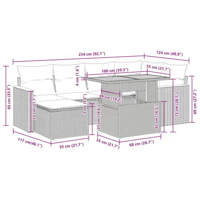 Ta vrtna sedežna garnitura je popoln dodatek za vaše dvorišče, teraso ali verando, saj zagotavlja udoben in vabljiv prostor za klepet z družino in prijatelji ali preprosto za sprostitev in uživanje na prostem.Trpežen material: PE ratan, znan tudi kot poli ratan, je močan sintetični material, ki ne potrebuje vzdrževanja in je videti kot naravni ratan. Je lahek, enostaven za čiščenje in se zaradi svoje vzdržljivosti in odpornosti na vremenske vplive pogosto uporablja za zunanje pohištvo.Funkcija shranjevanja z vodoodporno vrečo: Vsak vrtni sedež ima prostor za shranjevanje pod sedežem, skupaj z vodoodporno vrečo za shranjevanje blazin, igrač in drugih predmetov. Notranje vreče imajo zgornjo prevleko in jih je mogoče s pomočjo primenjal varno pritrditi na sedeže za dodatno varnost.Prevleko je mogoče odstraniti in oprati: Te sedežne blazine imajo odstranljive prevleke za lažje pranje in vzdrževanje.Modularna zasnova: Ta komplet zunanjega pohištva ima modularno zasnovo, zaradi česar je popolnoma prilagodljiv in enostaven za premikanje, tako da lahko zunanjo garnituro postavite kakor koli želite.Dobro je vedeti:Če želite, da vaše zunanje pohištvo ostane lepo, vam priporočamo, da ga zaščitite z vodoodporno prevleko.Največja dovoljena teža (na sedež): 110 kgUV-odpornoPlastične nastavljive nogePotrebno sestavljanje: DaKotni sedež:Barva: BežMaterial: PE ratan, jeklen okvir s prašnim premazomDimenzije: 62 x 62 x 69 cm (Š x G x V)Velikost sedeža: 55 x 55 cm (Š x G)Višina sedeža od tal (brez blazine): 37 cmSrednji sedež:Barva: BežMaterial: PE ratan, jeklen okvir s prašnim premazomDimenzije: 55 x 62 x 69 cm (Š x G x V)Velikost sedeža: 55 x 55 cm (Š x G)Višina sedeža od tal (brez blazine): 37 cmStolček:Barva: BežMaterial: PE ratan, jeklen okvir s prašnim premazomDimenzije: 55 x 55 x 37 cm (Š x G x V)Kotni sedež s naslonom za roke iz ratana:Barva: BežMaterial: PE ratan, prašno premazano jeklo, trden akacijev les z oljnim premazomDimenzije: 62 x 62 x 69 cm (Š x G x V)Velikost sedeža: 55 x 55 cm (Š x G)Višina sedeža od tal (brez blazine): 37 cmVišina naslonjal za roke od tal: 55 cmMiza:Barva: BežMaterial: PE ratan, prašno premazano jeklo, trden akacijev les z oljnim premazomDimenzije: 100 x 55 x 44/73 cm (D x Š x V)Blazina:Barva: Kremno belaMaterial prevleke: Tkanina (100 % poliester)Polnilo sedežne blazine: PenaPolnilo hrbtne blazine: bombažna vlaknaDimenzije sedežne blazine: 55 x 55 x 3 cm (Š x G x D)Dimenzije hrbtne blazine: 55 x 45 x 13 cm (D x Š x D)Paket vsebuje:1 x Vrtna miza1 x Kotni kavč s funkcijo shranjevanja z vodoodporno vrečo2 x Kotni sedež z naslonom za roke iz ratana s funkcijo shranjevanja z vodoodporno torbo2 x Srednji kavč s funkcijo shranjevanja z vodoodporno vrečo1 x Stolček s funkcijo shranjevanja z vodoodporno vrečo6 x Sedežna blazina s snemljivo pralno prevleko6 x Blazina za hrbet 3327509