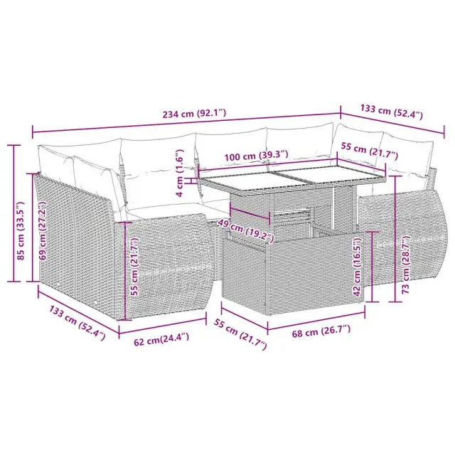 Ta vrtna sedežna garnitura je popoln dodatek za vaše dvorišče, teraso ali verando, saj zagotavlja udoben in vabljiv prostor za klepet z družino in prijatelji ali preprosto za sprostitev in uživanje na prostem. Trpežen material: PE ratan, znan tudi kot poli ratan, je močan sintetični material, ki ne potrebuje vzdrževanja in je videti kot naravni ratan. Je lahek, enostaven za čiščenje in se zaradi svoje vzdržljivosti in odpornosti na vremenske vplive pogosto uporablja za zunanje pohištvo.Funkcija shranjevanja z vodoodporno vrečo: Vsak vrtni sedež ima pod sedežem prostor za shranjevanje, opremljen z vodoodporno vrečo za shranjevanje blazin, igrač in drugih predmetov. Notranja torba ima zgornji pokrov in jo je mogoče varno pritrditi na sedež s kavljem in zanko za večjo stabilnost.Nastavljiva mizna plošča: Z dvigom mizne plošče lahko mizo povišate, s čimer se zunanja klubska mizica spremeni v jedilno mizo. Popolna je za sprejemanje gostov ali uživanje v obrokih na prostem.Prevleko je mogoče odstraniti in oprati: Te sedežne blazine imajo odstranljive prevleke za lažje pranje in vzdrževanje.Robusten in stabilen okvir: Jeklen okvir s prašnim premazom je močan, stabilen, trpežen ter odporen na korozijo in slabe vremenske razmere, kar zagotavlja dolgotrajno delovanje. Dobro je vedeti:Če želite, da vaše zunanje pohištvo ostane lepo, vam priporočamo, da ga zaščitite z vodoodporno prevleko.Dimenzije vodoodporne vreče: 55 x 53 x 34 cm (D x Š x V)Največja dovoljena teža (na sedež): 110 kgUV-odpornoPlastične nastavljive nogePotrebno sestavljanje: DaSrednji sedež:Barva: Svetlo sivaMaterial: PE ratan, jeklen okvir s prašnim premazomDimenzije: 55 x 62 x 69 cm (Š x G x V)Velikost sedeža: 55 x 55 cm (Š x G)Višina sedeža od tal (brez blazine): 37 cmKotni sedež:Barva: Svetlo sivaMaterial: PE ratan, jeklen okvir s prašnim premazomDimenzije: 62 x 62 x 69 cm (Š x G x V)Velikost sedeža: 55 x 55 cm (Š x G)Višina sedeža od tal (brez blazine): 37 cmKavč z naslonjali za roke:Barva: Svetlo sivaMaterial: PE ratan, jeklen okvir s prašnim premazomDimenzije: 71 x 62 x 69 cm (Š x G x V)Velikost sedeža: 55 x 55 cm (Š x G)Višina sedeža od tal (brez blazine): 37 cmVišina naslonjal za roke od tal: 55 cmMiza:Barva: Svetlo sivaMaterial: PE ratan, jeklo s prašnim premazom, kaljeno stekloDimenzije: 100 x 55 x 44/73 cm (D x Š x V)Blazina:Barva: Temno sivaMaterial prevleke: Tkanina (100 % poliester)Polnilo sedežne blazine: PenaPolnilo hrbtne blazine: bombažna vlaknaDimenzije sedežne blazine: 55 x 55 x 3 cm (Š x G x D)Dimenzije hrbtne blazine: 55 x 45 x 13 cm (D x Š x D)Paket vsebuje:2 x Srednji kavč s funkcijo shranjevanja z vodoodporno vrečo2 x Kotni kavč s funkcijo shranjevanja z vodoodporno vrečo2 x Kavč s funkcijo shranjevanja z vodoodporno vrečo1 x Miza8 x Blazina za hrbet6 x Sedežna blazina s snemljivo pralno prevleko 3326593