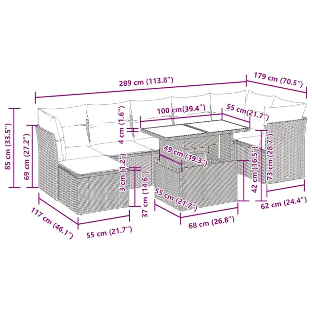 Ta vrtna sedežna garnitura je popoln dodatek za vaše dvorišče, teraso ali verando, saj zagotavlja udoben in vabljiv prostor za klepet z družino in prijatelji ali preprosto za sprostitev in uživanje na prostem. Trpežen material: PE ratan, znan tudi kot poli ratan, je močan sintetični material, ki ne potrebuje vzdrževanja in je videti kot naravni ratan. Je lahek, enostaven za čiščenje in se zaradi svoje vzdržljivosti in odpornosti na vremenske vplive pogosto uporablja za zunanje pohištvo.Funkcija shranjevanja z vodoodporno vrečo: Vsak vrtni sedež ima pod sedežem prostor za shranjevanje, opremljen z vodoodporno vrečo za shranjevanje blazin, igrač in drugih predmetov. Notranja torba ima zgornji pokrov in jo je mogoče varno pritrditi na sedež s kavljem in zanko za večjo stabilnost.Nastavljiva mizna plošča: Z dvigom mizne plošče lahko mizo povišate, s čimer se zunanja klubska mizica spremeni v jedilno mizo. Popolna je za sprejemanje gostov ali uživanje v obrokih na prostem.Vsestranski stolček za noge: Stolček je vsestransko uporaben, saj služi kot udoben naslon za noge, ko ležite na kavču, ali kot dodaten sedež na vrtu.Prevleko je mogoče odstraniti in oprati: Te sedežne blazine imajo odstranljive prevleke za lažje pranje in vzdrževanje.Robusten in stabilen okvir: Jeklen okvir s prašnim premazom je močan, stabilen, trpežen ter odporen na korozijo in slabe vremenske razmere, kar zagotavlja dolgotrajno delovanje. Dobro je vedeti:Če želite, da vaše zunanje pohištvo ostane lepo, vam priporočamo, da ga zaščitite z vodoodporno prevleko.Dimenzije vodoodporne vreče: 55 x 53 x 34 cm (D x Š x V)Največja dovoljena teža (na sedež): 110 kgUV-odpornoPlastične nastavljive nogePotrebno sestavljanje: DaSrednji sedež:Barva: RjavaMaterial: PE ratan, jeklen okvir s prašnim premazomDimenzije: 55 x 62 x 69 cm (Š x G x V)Velikost sedeža: 55 x 55 cm (Š x G)Višina sedeža od tal (brez blazine): 37 cmKotni sedež:Barva: RjavaMaterial: PE ratan, jeklen okvir s prašnim premazomDimenzije: 62 x 62 x 69 cm (Š x G x V)Velikost sedeža: 55 x 55 cm (Š x G)Višina sedeža od tal (brez blazine): 37 cmStolček za noge:Barva: RjavaMaterial: PE ratan, jeklen okvir s prašnim premazomDimenzije: 55 x 55 x 37 cm (Š x G x V)Miza:Barva: RjavaMaterial: PE ratan, jeklo s prašnim premazom, kaljeno stekloDimenzije: 100 x 55 x 44/73 cm (D x Š x V)Blazina:Barva: Kremno belaMaterial prevleke: Tkanina (100 % poliester)Polnilo sedežne blazine: PenaPolnilo hrbtne blazine: bombažna vlaknaDimenzije sedežne blazine: 55 x 55 x 3 cm (Š x G x D)Dimenzije hrbtne blazine: 55 x 45 x 13 cm (D x Š x D)Paket vsebuje:3 x Srednji kavč s funkcijo shranjevanja z vodoodporno vrečo3 x Kotni kavč s funkcijo shranjevanja z vodoodporno vrečo1 x Stolček za noge s funkcijo shranjevanja z vodoodporno vrečo1 x Miza9 x Blazina za hrbet7 x Sedežna blazina s snemljivo in pralno prevleko 3326204