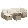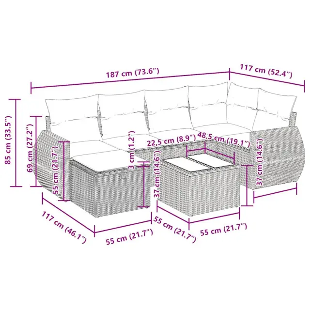 Ta vrtna sedežna garnitura je popoln dodatek za vaše dvorišče, teraso ali verando, saj zagotavlja udoben in vabljiv prostor za klepet z družino in prijatelji ali preprosto za sprostitev in uživanje na prostem. Trpežen material: PE ratan, znan tudi kot poli ratan, je močan sintetični material, ki ne potrebuje vzdrževanja in je videti kot naravni ratan. Je lahek, enostaven za čiščenje in se zaradi svoje vzdržljivosti in odpornosti na vremenske vplive pogosto uporablja za zunanje pohištvo.Funkcija shranjevanja z vodoodporno torbo: Vrtno pohištvo ima pod sedežem prostor za shranjevanje, opremljen z vodoodporno torbo za shranjevanje blazin, igrač in drugih stvari. Notranjo torbo je mogoče varno pritrditi na zunanje pohištvo s kavljem in zanko za večjo stabilnost.Vsestranski stolček za noge: Stolček je vsestransko uporaben, saj služi kot udoben naslon za noge, ko ležite na kavču, ali kot dodaten sedež na vrtu.Prevleko je mogoče odstraniti in oprati: Te sedežne blazine imajo odstranljive prevleke za lažje pranje in vzdrževanje.Modularna zasnova: Ta komplet zunanjega pohištva ima modularno zasnovo, zaradi česar je popolnoma prilagodljiv in enostaven za premikanje, tako da lahko zunanjo garnituro postavite kakor koli želite. Dobro je vedeti:Če želite, da vaše zunanje pohištvo ostane lepo, vam priporočamo, da ga zaščitite z vodoodporno prevleko.Dimenzije vodoodporne vreče: 55 x 53 x 34 cm (D x Š x V)Največja dovoljena teža (na sedež): 110 kgUV-odpornoPlastične nastavljive nogePotrebno sestavljanje: DaKavč z naslonjali za roke:Barva: BežMaterial: PE ratan, jeklen okvir s prašnim premazomDimenzije: 71 x 62 x 69 cm (Š x G x V)Velikost sedeža: 55 x 55 cm (Š x G)Višina sedeža od tal (brez blazine): 37 cmVišina naslonjal za roke od tal: 55 cmKotni sedež:Barva: BežMaterial: PE ratan, jeklen okvir s prašnim premazomDimenzije: 62 x 62 x 69 cm (Š x G x V)Velikost sedeža: 55 x 55 cm (Š x G)Višina sedeža od tal (brez blazine): 37 cmSrednji sedež:Barva: BežMaterial: PE ratan, jeklen okvir s prašnim premazomDimenzije: 55 x 62 x 69 cm (Š x G x V)Velikost sedeža: 55 x 55 cm (Š x G)Višina sedeža od tal (brez blazine): 37 cmStolček za noge:Barva: BežMaterial: PE ratan, jeklen okvir s prašnim premazomDimenzije: 55 x 55 x 37 cm (Š x G x V)Vrtna miza:Barva: BežMaterial: PE ratan, jeklo s prašnim premazom, kaljeno stekloDimenzije: 55 x 55 x 37 cm (Š x G x V)Blazina:Barva: Kremno belaMaterial prevleke: Tkanina (100 % poliester)Polnilo sedežne blazine: PenaPolnilo hrbtne blazine: bombažna vlaknaDimenzije sedežne blazine: 55 x 55 x 3 cm (Š x G x D)Dimenzije hrbtne blazine: 55 x 45 x 13 cm (D x Š x D) Paket vsebuje:2 x Kavč s funkcijo shranjevanja z vodoodporno vrečo1 x Kotni kavč s funkcijo shranjevanja z vodoodporno vrečo2 x Srednji kavč s funkcijo shranjevanja z vodoodporno vrečo1 x Stolček s funkcijo shranjevanja1 x Vrtna miza6 x Blazina za hrbet6 x Sedežna blazina s snemljivo pralno prevleko 3325594