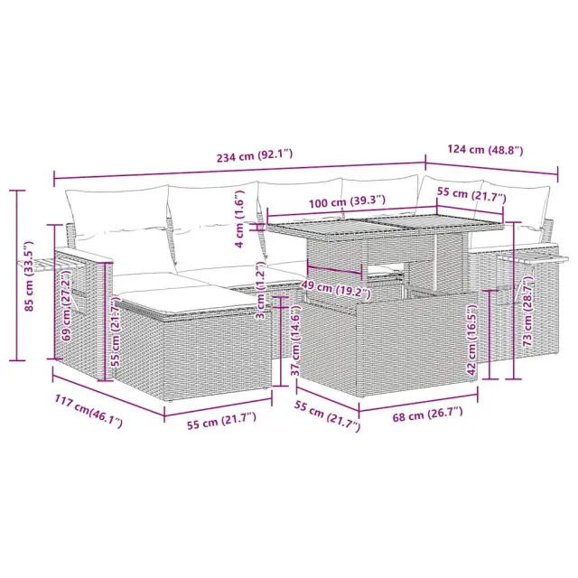 Ta vrtna sedežna garnitura je popoln dodatek za vaše dvorišče, teraso ali verando, saj zagotavlja udoben in vabljiv prostor za klepet z družino in prijatelji ali preprosto za sprostitev in uživanje na prostem.Trpežen material: PE ratan, znan tudi kot poli ratan, je močan sintetični material, ki ne potrebuje vzdrževanja in je videti kot naravni ratan. Je lahek, enostaven za čiščenje in se zaradi svoje vzdržljivosti in odpornosti na vremenske vplive pogosto uporablja za zunanje pohištvo.Funkcija shranjevanja z vodoodporno vrečo: Vsak vrtni sedež ima prostor za shranjevanje pod sedežem, skupaj z vodoodporno vrečo za shranjevanje blazin, igrač in drugih predmetov. Notranje vreče imajo zgornjo prevleko in jih je mogoče s pomočjo primenjal varno pritrditi na sedeže za dodatno varnost.Priročna stranska mizica: To zunanje pohištvo ima zložljivo stransko mizico s plinsko vzmetjo, ki zagotavlja priročen prostor za shranjevanje vaših potrebščin na dosegu roke.Prevleko je mogoče odstraniti in oprati: Te sedežne blazine imajo odstranljive prevleke za lažje pranje in vzdrževanje.Modularna zasnova: Ta komplet zunanjega pohištva ima modularno zasnovo, zaradi česar je popolnoma prilagodljiv in enostaven za premikanje, tako da lahko zunanjo garnituro postavite kakor koli želite.Dobro je vedeti:Če želite, da vaše zunanje pohištvo ostane lepo, vam priporočamo, da ga zaščitite z vodoodporno prevleko.Največja dovoljena teža (na sedež): 110 kgUV-odpornoPlastične nastavljive nogePotrebno sestavljanje: DaKotni sedež:Barva: BežMaterial: PE ratan, jeklen okvir s prašnim premazomDimenzije: 62 x 62 x 69 cm (Š x G x V)Velikost sedeža: 55 x 55 cm (Š x G)Višina sedeža od tal (brez blazine): 37 cmSrednji sedež:Barva: BežMaterial: PE ratan, jeklen okvir s prašnim premazomDimenzije: 55 x 62 x 69 cm (Š x G x V)Velikost sedeža: 55 x 55 cm (Š x G)Višina sedeža od tal (brez blazine): 37 cmStolček:Barva: BežMaterial: PE ratan, jeklen okvir s prašnim premazomDimenzije: 55 x 55 x 37 cm (Š x G x V)Kotni sedež z naslonom za roke iz akacijevega lesaBarva: BežMaterial: PE ratan, prašno premazano jeklo, trden akacijev les z oljnim premazomDimenzije: 62 x 62 x 69 cm (Š x G x V)Velikost sedeža: 55 x 55 cm (Š x G)Višina sedeža od tal (brez blazine): 37 cmVišina naslonjal za roke od tal: 55 cmŠirina naslonjala za roke: 6 cmVelikost stranske mizice: 24,5 x 23,5 cm (D × Š)Miza:Barva: BežMaterial: PE ratan, prašno premazano jeklo, trden akacijev les z oljnim premazomDimenzije: 100 x 55 x 44/73 cm (D x Š x V)Blazina:Barva: Kremno belaMaterial prevleke: Tkanina (100 % poliester)Polnilo sedežne blazine: PenaPolnilo hrbtne blazine: bombažna vlaknaDimenzije sedežne blazine: 55 x 55 x 3 cm (Š x G x D)Dimenzije hrbtne blazine: 55 x 45 x 13 cm (D x Š x D)Paket vsebuje:1 x Vrtna miza3 x Kotni kavč s funkcijo shranjevanja z vodoodporno vrečo2 x Srednji kavč s funkcijo shranjevanja z vodoodporno vrečo1 x Stolček s funkcijo shranjevanja z vodoodporno vrečo5 x Sedežna blazina s snemljivo pralno prevleko6 x Blazina za hrbet 3327621