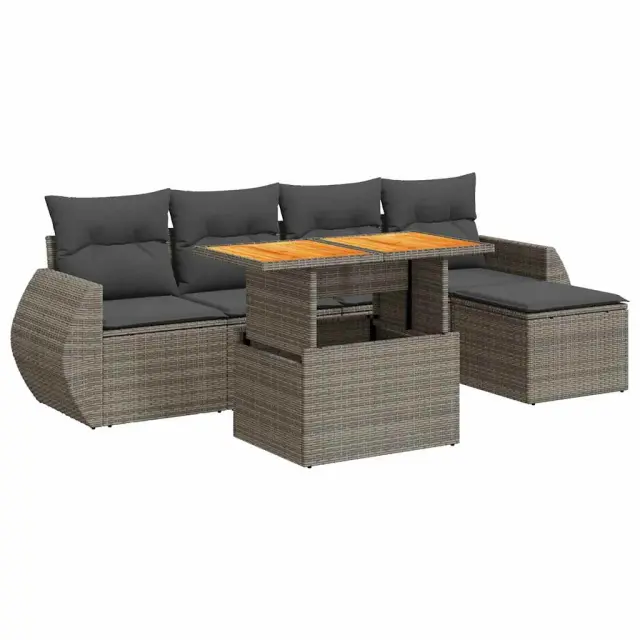 Ta vrtna sedežna garnitura je popoln dodatek za vaše dvorišče, teraso ali verando, saj zagotavlja udoben in vabljiv prostor za klepet z družino in prijatelji ali preprosto za sprostitev in uživanje na prostem. Trpežen material: PE ratan, znan tudi kot poli ratan, je močan sintetični material, ki ne potrebuje vzdrževanja in je videti kot naravni ratan. Je lahek, enostaven za čiščenje in se zaradi svoje vzdržljivosti in odpornosti na vremenske vplive pogosto uporablja za zunanje pohištvo.Funkcija shranjevanja z vodoodporno torbo: Vrtno pohištvo ima pod sedežem prostor za shranjevanje, opremljen z vodoodporno torbo za shranjevanje blazin, igrač in drugih stvari. Notranjo torbo je mogoče varno pritrditi na zunanje pohištvo s kavljem in zanko za večjo stabilnost.Nastavljiva mizna plošča: Z dvigom mizne plošče lahko mizo povišate, s čimer se zunanja klubska mizica spremeni v jedilno mizo. Popolna je za sprejemanje gostov ali uživanje v obrokih na prostem.Prevleko je mogoče odstraniti in oprati: Te sedežne blazine imajo odstranljive prevleke za lažje pranje in vzdrževanje.Modularna zasnova: Ta komplet zunanjega pohištva ima modularno zasnovo, zaradi česar je popolnoma prilagodljiv in enostaven za premikanje, tako da lahko zunanjo garnituro postavite kakor koli želite. Dobro je vedeti:Če želite, da vaše zunanje pohištvo ostane lepo, vam priporočamo, da ga zaščitite z vodoodporno prevleko.Dimenzije vodoodporne vreče: 55 x 53 x 34 cm (D x Š x V)Maksimalna nosilnost (na sedež): 110 kgUV-odpornoPlastične nastavljive nogePotrebno sestavljanje: DaKotni sedež:Barva: SivaMaterial: PE ratan, jeklen okvir s prašnim premazomDimenzije: 71 x 62 x 69 cm (Š x G x V)Velikost sedeža: 55 x 55 cm (Š x G)Višina sedeža od tal (brez blazine): 37 cmVišina naslonjal za roke od tal: 55 cmSrednji sedež:Barva: SivaMaterial: PE ratan, jeklen okvir s prašnim premazomDimenzije: 55 x 62 x 69 cm (Š x G x V)Velikost sedeža: 55 x 55 cm (Š x G)Višina sedeža od tal (brez blazine): 37 cmStolček za noge:Barva: SivaMaterial: PE ratan, jeklen okvir s prašnim premazomDimenzije: 55 x 55 x 37 cm (Š x G x V)Miza:Barva: SivaMaterial: PE ratan, prašno premazano jeklo, trden akacijev les z oljnim premazomDimenzije: 100 x 55 x 44/73 cm (D x Š x V)Blazina:Barva: Temno sivaMaterial prevleke: Tkanina (100 % poliester)Polnilo sedežne blazine: PenaPolnilo hrbtne blazine: bombažna vlaknaDimenzije sedežne blazine: 55 x 55 x 3 cm (Š x G x D)Dimenzije hrbtne blazine: 55 x 45 x 13 cm (D x Š x D)Paket vsebuje:1 x Vrtna miza2 x Kotni kavč s funkcijo shranjevanja z vodoodporno vrečo2 x Srednji kavč s funkcijo shranjevanja z vodoodporno vrečo1 x Stolček za noge s funkcijo shranjevanja z vodoodporno vrečo4 x Blazina za hrbet5 x Sedežna blazina s snemljivo pralno prevleko 3327252