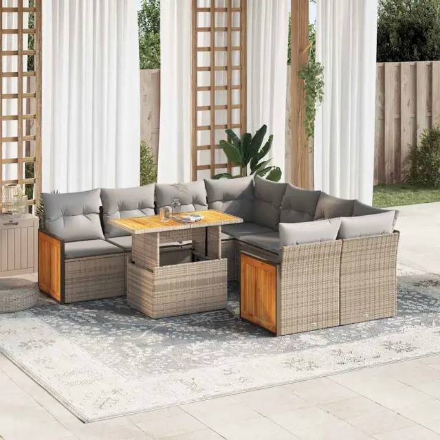 Ta vrtna sedežna garnitura je popoln dodatek za vaše dvorišče, teraso ali verando, saj zagotavlja udoben in vabljiv prostor za klepet z družino in prijatelji ali preprosto za sprostitev in uživanje na prostem. Trpežen material: PE ratan, znan tudi kot poli ratan, je močan sintetični material, ki ne potrebuje vzdrževanja in je videti kot naravni ratan. Je lahek, enostaven za čiščenje in se zaradi svoje vzdržljivosti in odpornosti na vremenske vplive pogosto uporablja za zunanje pohištvo.Funkcija shranjevanja z vodoodporno vrečo: Vsak vrtni sedež ima prostor za shranjevanje pod sedežem, skupaj z vodoodporno vrečo za shranjevanje blazin, igrač in drugih predmetov. Notranje vreče imajo zgornjo prevleko in jih je mogoče s pomočjo primenjal varno pritrditi na sedeže za dodatno varnost.Prevleko je mogoče odstraniti in oprati: Te sedežne blazine imajo odstranljive prevleke za lažje pranje in vzdrževanje.Modularna zasnova: Ta komplet zunanjega pohištva ima modularno zasnovo, zaradi česar je popolnoma prilagodljiv in enostaven za premikanje, tako da lahko zunanjo garnituro postavite kakor koli želite. Dobro je vedeti:Če želite, da vaše zunanje pohištvo ostane lepo, vam priporočamo, da ga zaščitite z vodoodporno prevleko.Dimenzije vodoodporne vreče: 55 x 53 x 34 cm (D x Š x V)Največja dovoljena teža (na sedež): 110 kgUV-odpornoPlastične nastavljive nogePotrebno sestavljanje: DaSrednji sedež:Barva: BežMaterial: PE ratan, jeklen okvir s prašnim premazomDimenzije: 55 x 62 x 69 cm (Š x G x V)Velikost sedeža: 55 x 55 cm (Š x G)Višina sedeža od tal (brez blazine): 37 cmKotni sedež:Barva: BežMaterial: PE ratan, jeklen okvir s prašnim premazomDimenzije: 62 x 62 x 69 cm (Š x G x V)Velikost sedeža: 55 x 55 cm (Š x G)Višina sedeža od tal (brez blazine): 37 cmKavč z naslonjali za roke:Barva: BežMaterial: PE ratan, prašno premazano jeklo, trden akacijev les z oljnim premazomDimenzije: 59 x 62 x 69 cm (Š x G x V)Velikost sedeža: 55 x 55 cm (Š x G)Višina sedeža od tal (brez blazine): 37 cmMiza:Barva: BežMaterial: PE ratan, prašno premazano jeklo, trden akacijev les z oljnim premazomDimenzije: 100 x 55 x 44/73 cm (D x Š x V)Blazina:Barva: Svetlo sivaMaterial prevleke: Tkanina (100 % poliester)Polnilo sedežne blazine: PenaPolnilo hrbtne blazine: bombažna vlaknaDimenzije sedežne blazine: 55 x 55 x 3 cm (Š x G x D)Dimenzije hrbtne blazine: 55 x 45 x 13 cm (D x Š x D)Paket vsebuje:4 x Srednji kavč s funkcijo shranjevanja z vodoodporno vrečo2 x Kotni kavč s funkcijo shranjevanja z vodoodporno vrečo2 x Kavč s funkcijo shranjevanja z vodoodporno vrečo1 x Miza10 x Blazina za hrbet8 x Sedežna blazina s snemljivo in pralno prevleko 3327692