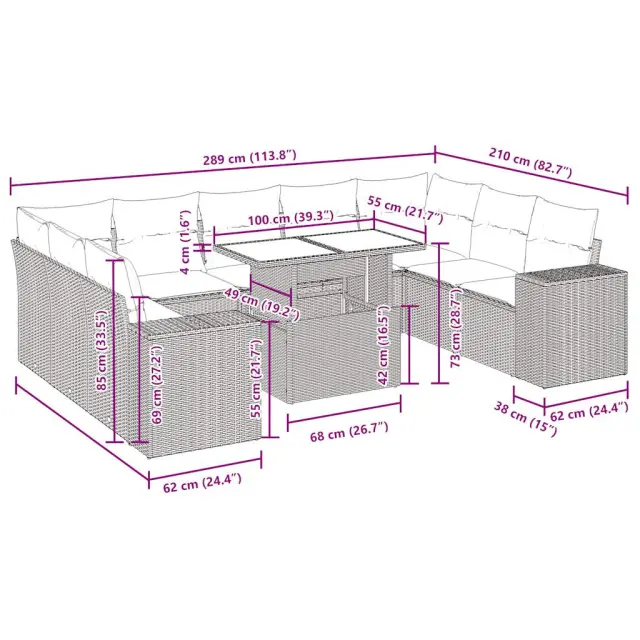 Ta vrtna sedežna garnitura je popoln dodatek za vaše dvorišče, teraso ali verando, saj zagotavlja udoben in vabljiv prostor za klepet z družino in prijatelji ali preprosto za sprostitev in uživanje na prostem. Trpežen material: PE ratan, znan tudi kot poli ratan, je močan sintetični material, ki ne potrebuje vzdrževanja in je videti kot naravni ratan. Je lahek, enostaven za čiščenje in se zaradi svoje vzdržljivosti in odpornosti na vremenske vplive pogosto uporablja za zunanje pohištvo.Funkcija shranjevanja z vodoodporno torbo: Vrtno pohištvo ima pod sedežem prostor za shranjevanje, opremljen z vodoodporno torbo za shranjevanje blazin, igrač in drugih stvari. Notranjo torbo je mogoče varno pritrditi na zunanje pohištvo s kavljem in zanko za večjo stabilnost.Nastavljiva mizna plošča: Z dvigom mizne plošče lahko mizo povišate, s čimer se zunanja klubska mizica spremeni v jedilno mizo. Popolna je za sprejemanje gostov ali uživanje v obrokih na prostem.Prevleko je mogoče odstraniti in oprati: Te sedežne blazine imajo odstranljive prevleke za lažje pranje in vzdrževanje.Modularna zasnova: Ta komplet zunanjega pohištva ima modularno zasnovo, zaradi česar je popolnoma prilagodljiv in enostaven za premikanje, tako da lahko zunanjo garnituro postavite kakor koli želite. Dobro je vedeti:Če želite, da vaše zunanje pohištvo ostane lepo, vam priporočamo, da ga zaščitite z vodoodporno prevleko.Dimenzije vodoodporne vreče: 55 x 53 x 34 cm (D x Š x V)Maksimalna nosilnost (na sedež): 110 kgUV-odpornoPlastične nastavljive nogePotrebno sestavljanje: DaKotni sedež:Barva: BežMaterial: PE ratan, jeklen okvir s prašnim premazomDimenzije: 62 x 62 x 69 cm (Š x G x V)Velikost sedeža: 55 x 55 cm (Š x G)Višina sedeža od tal (brez blazine): 37 cmKotni sedež s naslonom za roke iz ratana:Barva: BežMaterial: PE ratan, jeklen okvir s prašnim premazomDimenzije: 83 x 62 x 69 cm (Š x G x V)Velikost sedeža: 55 x 55 cm (Š x G)Višina sedeža od tal (brez blazine): 37 cmVišina naslonjal za roke od tal: 55 cmŠirina naslona za roke: 27,5 cmSrednji sedež:Barva: BežMaterial: PE ratan, jeklen okvir s prašnim premazomDimenzije: 55 x 62 x 69 cm (Š x G x V)Velikost sedeža: 55 x 55 cm (Š x G)Višina sedeža od tal (brez blazine): 37 cmMiza:Barva: BežMaterial: PE ratan, jeklo s prašnim premazom, kaljeno stekloDimenzije: 100 x 55 x 44/73 cm (D x Š x V)Blazina:Barva: Svetlo sivaMaterial prevleke: Tkanina (100 % poliester)Polnilo sedežne blazine: PenaPolnilo hrbtne blazine: bombažna vlaknaDimenzije sedežne blazine: 55 x 55 x 3 cm (Š x G x D)Dimenzije hrbtne blazine: 55 x 45 x 13 cm (D x Š x D)Paket vsebuje:1 x Vrtna miza2 x Kotni kavč s funkcijo shranjevanja z vodoodporno vrečo2 x Kotni sedež z naslonom za roke iz ratana s funkcijo shranjevanja z vodoodporno torbo5 x Srednji sedež s funkcijo shranjevanja z vodoodporno vrečo11 x Blazina za hrbet9 x Sedežna blazina s snemljivo in pralno prevleko 3326860