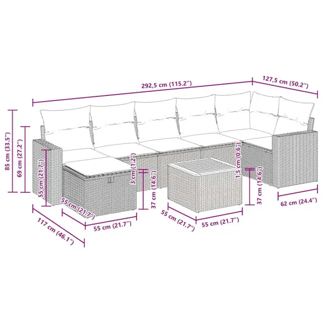 Ta vrtna sedežna garnitura je popoln dodatek za vaše dvorišče, teraso ali verando, saj zagotavlja udoben in vabljiv prostor za klepet z družino in prijatelji ali preprosto za sprostitev in uživanje na prostem. Trpežen material: PE ratan, znan tudi kot poli ratan, je močan sintetični material, ki ne potrebuje vzdrževanja in je videti kot naravni ratan. Je lahek, enostaven za čiščenje in se zaradi svoje vzdržljivosti in odpornosti na vremenske vplive pogosto uporablja za zunanje pohištvo.Funkcija shranjevanja z vodoodporno torbo: Vrtno pohištvo ima pod sedežem prostor za shranjevanje, opremljen z vodoodporno torbo za shranjevanje blazin, igrač in drugih stvari. Notranjo torbo je mogoče varno pritrditi na zunanje pohištvo s kavljem in zanko za večjo stabilnost.Vsestranski stolček za noge: Stolček je vsestransko uporaben, saj služi kot udoben naslon za noge, ko ležite na kavču, ali kot dodaten sedež na vrtu.Prevleko je mogoče odstraniti in oprati: Te sedežne blazine imajo odstranljive prevleke za lažje pranje in vzdrževanje.Modularna zasnova: Ta komplet zunanjega pohištva ima modularno zasnovo, zaradi česar je popolnoma prilagodljiv in enostaven za premikanje, tako da lahko zunanjo garnituro postavite kakor koli želite. Dobro je vedeti:Če želite, da vaše zunanje pohištvo ostane lepo, vam priporočamo, da ga zaščitite z vodoodporno prevleko.Dimenzije vodoodporne vreče: 55 x 53 x 34 cm (D x Š x V)Največja dovoljena teža (na sedež): 110 kgUV-odpornoPlastične nastavljive nogePotrebno sestavljanje: DaKavč z naslonjali za roke:Barva: ČrnaMaterial: PE ratan, jeklen okvir s prašnim premazomDimenzije: 65,5 x 62 x 69 cm (Š x G x V)Velikost sedeža: 55 x 55 cm (Š x G)Višina sedeža od tal (brez blazine): 37 cmVišina naslonjal za roke od tal: 55 cmŠirina naslonjala za roke: 10 cmKotni sedež:Barva: ČrnaMaterial: PE ratan, jeklen okvir s prašnim premazomDimenzije: 62 x 62 x 69 cm (Š x G x V)Velikost sedeža: 55 x 55 cm (Š x G)Višina sedeža od tal (brez blazine): 37 cmSrednji sedež:Barva: ČrnaMaterial: PE ratan, jeklen okvir s prašnim premazomDimenzije: 55 x 62 x 69 cm (Š x G x V)Velikost sedeža: 55 x 55 cm (Š x G)Višina sedeža od tal (brez blazine): 37 cmStolček za noge:Barva: ČrnaMaterial: PE ratan, jeklen okvir s prašnim premazomDimenzije: 55 x 55 x 37 cm (Š x G x V)Vrtna miza:Barva: Črna in rjavaMaterial: PE ratan, prašno premazano jeklo, trden akacijev les z oljnim premazomDimenzije: 55 x 55 x 37 cm (Š x G x V)Blazina:Barva: Kremno belaMaterial prevleke: Tkanina (100 % poliester)Polnilo sedežne blazine: PenaPolnilo hrbtne blazine: bombažna vlaknaDimenzije sedežne blazine: 55 x 55 x 3 cm (Š x G x D)Dimenzije hrbtne blazine: 55 x 45 x 13 cm (D x Š x D) Paket vsebuje:2 x Kavč s funkcijo shranjevanja z vodoodporno vrečo1 x Kotni kavč s funkcijo shranjevanja z vodoodporno vrečo3 x Srednji kavč s funkcijo shranjevanja z vodoodporno vrečo1 x Stolček s funkcijo shranjevanja1 x Vrtna miza7 x Hrbtna blazina7 x Sedežna blazina s snemljivo in pralno prevleko 3325794