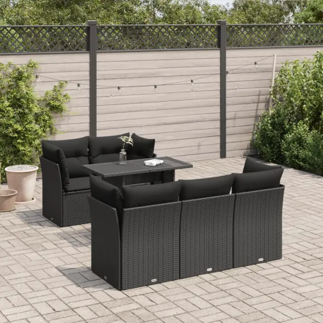 Ta vrtna sedežna garnitura je popoln dodatek za vaše dvorišče, teraso ali verando, saj zagotavlja udoben in vabljiv prostor za klepet z družino in prijatelji ali preprosto za sprostitev in uživanje na prostem. Trpežen material: PE ratan, znan tudi kot poli ratan, je močan sintetični material, ki ne potrebuje vzdrževanja in je videti kot naravni ratan. Je lahek, enostaven za čiščenje in se zaradi svoje vzdržljivosti in odpornosti na vremenske vplive pogosto uporablja za zunanje pohištvo.Funkcija shranjevanja z vodoodporno vrečo: Vsak vrtni sedež ima pod sedežem prostor za shranjevanje, opremljen z vodoodporno vrečo za shranjevanje blazin, igrač in drugih predmetov. Notranja torba ima zgornji pokrov in jo je mogoče varno pritrditi na sedež s kavljem in zanko za večjo stabilnost.Nastavljiva mizna plošča: Z dvigom mizne plošče lahko mizo povišate, s čimer se zunanja klubska mizica spremeni v jedilno mizo. Popolna je za sprejemanje gostov ali uživanje v obrokih na prostem.Prevleko je mogoče odstraniti in oprati: Te sedežne blazine imajo odstranljive prevleke za lažje pranje in vzdrževanje.Robusten in stabilen okvir: Jeklen okvir s prašnim premazom je močan, stabilen, trpežen ter odporen na korozijo in slabe vremenske razmere, kar zagotavlja dolgotrajno delovanje. Dobro je vedeti:Če želite, da vaše zunanje pohištvo ostane lepo, vam priporočamo, da ga zaščitite z vodoodporno prevleko.Dimenzije vodoodporne vreče: 55 x 53 x 34 cm (D x Š x V)Največja dovoljena teža (na sedež): 110 kgUV-odpornoPlastične nastavljive nogePotrebno sestavljanje: DaSrednji sedež:Barva: ČrnaMaterial: PE ratan, jeklen okvir s prašnim premazomDimenzije: 55 x 62 x 69 cm (Š x G x V)Velikost sedeža: 55 x 55 cm (Š x G)Višina sedeža od tal (brez blazine): 37 cmKotni sedež:Barva: ČrnaMaterial: PE ratan, jeklen okvir s prašnim premazomDimenzije: 62 x 62 x 69 cm (Š x G x V)Velikost sedeža: 55 x 55 cm (Š x G)Višina sedeža od tal (brez blazine): 37 cmMiza:Barva: ČrnaMaterial: PE ratan, jeklo s prašnim premazom, kaljeno stekloDimenzije: 100 x 55 x 44/73 cm (D x Š x V)Blazina:Barva: ČrnaMaterial prevleke: Tkanina (100 % poliester)Polnilo sedežne blazine: PenaPolnilo hrbtne blazine: bombažna vlaknaDimenzije sedežne blazine: 55 x 55 x 3 cm (Š x G x D)Dimenzije hrbtne blazine: 55 x 45 x 13 cm (D x Š x D)Paket vsebuje:1 x Srednji kavč s funkcijo shranjevanja z vodoodporno vrečo4 x Kotni sedež s funkcijo shranjevanja z vodoodporno vrečo1 x Miza9 x Blazina za hrbet5 x Sedežna blazina s snemljivo pralno prevleko 3326096