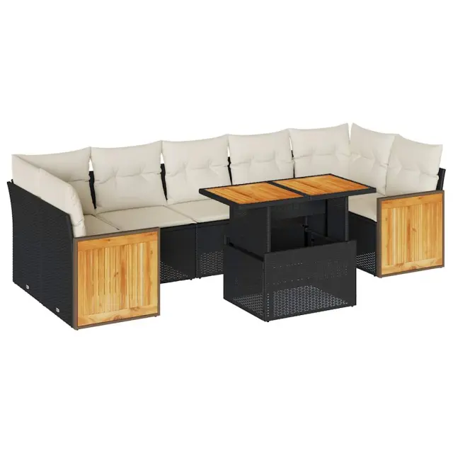 Ta vrtna sedežna garnitura je popoln dodatek za vaše dvorišče, teraso ali verando, saj zagotavlja udoben in vabljiv prostor za klepet z družino in prijatelji ali preprosto za sprostitev in uživanje na prostem. Trpežen material: PE ratan, znan tudi kot poli ratan, je močan sintetični material, ki ne potrebuje vzdrževanja in je videti kot naravni ratan. Je lahek, enostaven za čiščenje in se zaradi svoje vzdržljivosti in odpornosti na vremenske vplive pogosto uporablja za zunanje pohištvo.Funkcija shranjevanja z vodoodporno vrečo: Vsak vrtni sedež ima prostor za shranjevanje pod sedežem, skupaj z vodoodporno vrečo za shranjevanje blazin, igrač in drugih predmetov. Notranje vreče imajo zgornjo prevleko in jih je mogoče s pomočjo primenjal varno pritrditi na sedeže za dodatno varnost.Prevleko je mogoče odstraniti in oprati: Te sedežne blazine imajo odstranljive prevleke za lažje pranje in vzdrževanje.Modularna zasnova: Ta komplet zunanjega pohištva ima modularno zasnovo, zaradi česar je popolnoma prilagodljiv in enostaven za premikanje, tako da lahko zunanjo garnituro postavite kakor koli želite. Dobro je vedeti:Če želite, da vaše zunanje pohištvo ostane lepo, vam priporočamo, da ga zaščitite z vodoodporno prevleko.Dimenzije vodoodporne vreče: 55 x 53 x 34 cm (D x Š x V)Največja dovoljena teža (na sedež): 110 kgUV-odpornoPlastične nastavljive nogePotrebno sestavljanje: DaSrednji sedež:Barva: ČrnaMaterial: PE ratan, jeklen okvir s prašnim premazomDimenzije: 55 x 62 x 69 cm (Š x G x V)Velikost sedeža: 55 x 55 cm (Š x G)Višina sedeža od tal (brez blazine): 37 cmKotni sedež:Barva: ČrnaMaterial: PE ratan, jeklen okvir s prašnim premazomDimenzije: 62 x 62 x 69 cm (Š x G x V)Velikost sedeža: 55 x 55 cm (Š x G)Višina sedeža od tal (brez blazine): 37 cmKavč z naslonjali za roke:Barva: ČrnaMaterial: PE ratan, prašno premazano jeklo, trden akacijev les z oljnim premazomDimenzije: 59 x 62 x 69 cm (Š x G x V)Velikost sedeža: 55 x 55 cm (Š x G)Višina sedeža od tal (brez blazine): 37 cmMiza:Barva: ČrnaMaterial: PE ratan, prašno premazano jeklo, trden akacijev les z oljnim premazomDimenzije: 100 x 55 x 44/73 cm (D x Š x V)Blazina:Barva: BelaMaterial prevleke: Tkanina (100 % poliester)Polnilo sedežne blazine: PenaPolnilo hrbtne blazine: bombažna vlaknaDimenzije sedežne blazine: 55 x 55 x 3 cm (Š x G x D)Dimenzije hrbtne blazine: 55 x 45 x 13 cm (D x Š x D)Paket vsebuje:3 x Srednji kavč s funkcijo shranjevanja z vodoodporno vrečo2 x Kotni kavč s funkcijo shranjevanja z vodoodporno vrečo2 x Kavč s funkcijo shranjevanja z vodoodporno vrečo1 x Miza9 x Blazina za hrbet7 x Sedežna blazina s snemljivo in pralno prevleko 3327682