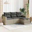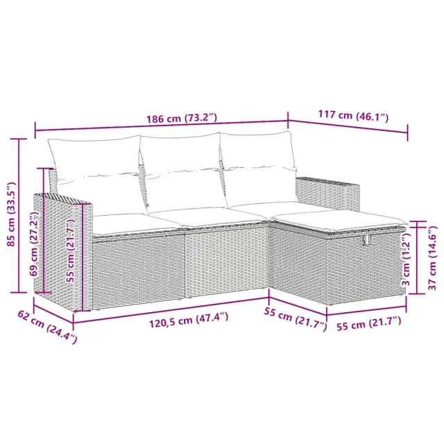 Ta vrtna sedežna garnitura je popoln dodatek za vaše dvorišče, teraso ali verando, saj zagotavlja udoben in vabljiv prostor za klepet z družino in prijatelji ali preprosto za sprostitev in uživanje na prostem. Trpežen material: PE ratan, znan tudi kot poli ratan, je močan sintetični material, ki ne potrebuje vzdrževanja in je videti kot naravni ratan. Je lahek, enostaven za čiščenje in se zaradi svoje vzdržljivosti in odpornosti na vremenske vplive pogosto uporablja za zunanje pohištvo.Funkcija shranjevanja z vodoodporno torbo: Vrtno pohištvo ima pod sedežem prostor za shranjevanje, opremljen z vodoodporno torbo za shranjevanje blazin, igrač in drugih stvari. Notranjo torbo je mogoče varno pritrditi na zunanje pohištvo s kavljem in zanko za večjo stabilnost.Vsestranski stolček za noge: Stolček je vsestransko uporaben, saj služi kot udoben naslon za noge, ko ležite na kavču, ali kot dodaten sedež na vrtu.Prevleko je mogoče odstraniti in oprati: Te sedežne blazine imajo odstranljive prevleke za lažje pranje in vzdrževanje.Modularna zasnova: Ta komplet zunanjega pohištva ima modularno zasnovo, zaradi česar je popolnoma prilagodljiv in enostaven za premikanje, tako da lahko zunanjo garnituro postavite kakor koli želite. Dobro je vedeti:Če želite, da vaše zunanje pohištvo ostane lepo, vam priporočamo, da ga zaščitite z vodoodporno prevleko.Dimenzije vodoodporne vreče: 55 x 53 x 34 cm (D x Š x V)Največja dovoljena teža (na sedež): 110 kgUV-odpornoPlastične nastavljive nogePotrebno sestavljanje: DaKavč z naslonjali za roke:Barva: Svetlo sivaMaterial: PE ratan, jeklen okvir s prašnim premazomDimenzije: 65,5 x 62 x 69 cm (Š x G x V)Velikost sedeža: 55 x 55 cm (Š x G)Višina sedeža od tal (brez blazine): 37 cmVišina naslonjal za roke od tal: 55 cmŠirina naslonjala za roke: 10 cmSrednji sedež:Barva: Svetlo sivaMaterial: PE ratan, jeklen okvir s prašnim premazomDimenzije: 55 x 62 x 69 cm (Š x G x V)Velikost sedeža: 55 x 55 cm (Š x G)Višina sedeža od tal (brez blazine): 37 cmStolček za noge:Barva: Svetlo sivaMaterial: PE ratan, jeklen okvir s prašnim premazomDimenzije: 55 x 55 x 37 cm (Š x G x V)Blazina:Barva: Temno sivaMaterial prevleke: Tkanina (100 % poliester)Polnilo sedežne blazine: PenaPolnilo hrbtne blazine: bombažna vlaknaDimenzije sedežne blazine: 55 x 55 x 3 cm (Š x G x D)Dimenzije hrbtne blazine: 55 x 45 x 13 cm (D x Š x D)Paket vsebuje:2 x Kavč s funkcijo shranjevanja z vodoodporno vrečo1 x Srednji kavč s funkcijo shranjevanja z vodoodporno vrečo1 x Stolček s funkcijo shranjevanja3 x Blazina za hrbet4 x Sedežna blazina s snemljivo in pralno prevleko 3325358