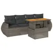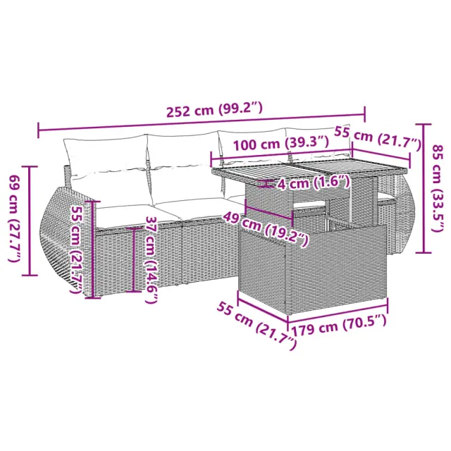 Ta vrtna sedežna garnitura je popoln dodatek za vaše dvorišče, teraso ali verando, saj zagotavlja udoben in vabljiv prostor za klepet z družino in prijatelji ali preprosto za sprostitev in uživanje na prostem. Trpežen material: PE ratan, znan tudi kot poli ratan, je močan sintetični material, ki ne potrebuje vzdrževanja in je videti kot naravni ratan. Je lahek, enostaven za čiščenje in se zaradi svoje vzdržljivosti in odpornosti na vremenske vplive pogosto uporablja za zunanje pohištvo.Funkcija shranjevanja z vodoodporno torbo: Vrtno pohištvo ima pod sedežem prostor za shranjevanje, opremljen z vodoodporno torbo za shranjevanje blazin, igrač in drugih stvari. Notranjo torbo je mogoče varno pritrditi na zunanje pohištvo s kavljem in zanko za večjo stabilnost.Nastavljiva mizna plošča: Z dvigom mizne plošče lahko mizo povišate, s čimer se zunanja klubska mizica spremeni v jedilno mizo. Popolna je za sprejemanje gostov ali uživanje v obrokih na prostem.Prevleko je mogoče odstraniti in oprati: Te sedežne blazine imajo odstranljive prevleke za lažje pranje in vzdrževanje.Modularna zasnova: Ta komplet zunanjega pohištva ima modularno zasnovo, zaradi česar je popolnoma prilagodljiv in enostaven za premikanje, tako da lahko zunanjo garnituro postavite kakor koli želite. Dobro je vedeti:Če želite, da vaše zunanje pohištvo ostane lepo, vam priporočamo, da ga zaščitite z vodoodporno prevleko.Dimenzije vodoodporne vreče: 55 x 53 x 34 cm (D x Š x V)Maksimalna nosilnost (na sedež): 110 kgUV-odpornoPlastične nastavljive nogePotrebno sestavljanje: DaKotni sedež:Barva: SivaMaterial: PE ratan, jeklen okvir s prašnim premazomDimenzije: 71 x 62 x 69 cm (Š x G x V)Velikost sedeža: 55 x 55 cm (Š x G)Višina sedeža od tal (brez blazine): 37 cmVišina naslonjal za roke od tal: 55 cmSrednji sedež:Barva: SivaMaterial: PE ratan, jeklen okvir s prašnim premazomDimenzije: 55 x 62 x 69 cm (Š x G x V)Velikost sedeža: 55 x 55 cm (Š x G)Višina sedeža od tal (brez blazine): 37 cmMiza:Barva: SivaMaterial: PE ratan, prašno premazano jeklo, trden akacijev les z oljnim premazomDimenzije: 100 x 55 x 44/73 cm (D x Š x V)Blazina:Barva: Temno sivaMaterial prevleke: Tkanina (100 % poliester)Polnilo sedežne blazine: PenaPolnilo hrbtne blazine: bombažna vlaknaDimenzije sedežne blazine: 55 x 55 x 3 cm (Š x G x D)Dimenzije hrbtne blazine: 55 x 45 x 13 cm (D x Š x D)Paket vsebuje:1 x Vrtna miza2 x Kotni kavč s funkcijo shranjevanja z vodoodporno vrečo2 x Srednji kavč s funkcijo shranjevanja z vodoodporno vrečo4 x Blazina za hrbet4 x Sedežna blazina s snemljivo in pralno prevleko 3327210