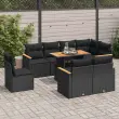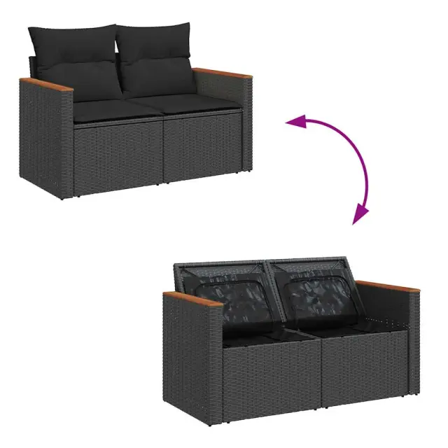 Ta vrtna sedežna garnitura je popoln dodatek za vaše dvorišče, teraso ali verando, saj zagotavlja udoben in vabljiv prostor za klepet z družino in prijatelji ali preprosto za sprostitev in uživanje na prostem.Trpežen material: PE ratan, znan tudi kot poli ratan, je močan sintetični material, ki ne potrebuje vzdrževanja in je videti kot naravni ratan. Je lahek, enostaven za čiščenje in se zaradi svoje vzdržljivosti in odpornosti na vremenske vplive pogosto uporablja za zunanje pohištvo.Funkcija shranjevanja z vodoodporno vrečo: Vsak vrtni sedež ima prostor za shranjevanje pod sedežem, skupaj z vodoodporno vrečo za shranjevanje blazin, igrač in drugih predmetov. Notranje vreče imajo zgornjo prevleko in jih je mogoče s pomočjo primenjal varno pritrditi na sedeže za dodatno varnost.Prevleko je mogoče odstraniti in oprati: Te sedežne blazine imajo odstranljive prevleke za lažje pranje in vzdrževanje.Modularna zasnova: Ta komplet zunanjega pohištva ima modularno zasnovo, zaradi česar je popolnoma prilagodljiv in enostaven za premikanje, tako da lahko zunanjo garnituro postavite kakor koli želite.Dobro je vedeti:Če želite, da vaše zunanje pohištvo ostane lepo, vam priporočamo, da ga zaščitite z vodoodporno prevleko.Največja dovoljena teža (na sedež): 110 kgUV-odpornoPlastične nastavljive nogePotrebno sestavljanje: DaKotni sedež:Barva: ČrnaMaterial: PE ratan, jeklen okvir s prašnim premazomDimenzije: 62 x 62 x 69 cm (Š x G x V)Velikost sedeža: 55 x 55 cm (Š x G)Višina sedeža od tal (brez blazine): 37 cmSrednji sedež:Barva: ČrnaMaterial: PE ratan, jeklen okvir s prašnim premazomDimenzije: 55 x 62 x 69 cm (Š x G x V)Velikost sedeža: 55 x 55 cm (Š x G)Višina sedeža od tal (brez blazine): 37 cmKotni sedež s naslonom za roke iz ratana:Barva: ČrnaMaterial: PE ratan, prašno premazano jeklo, trden akacijev les z oljnim premazomDimenzije: 62 x 62 x 69 cm (Š x G x V)Velikost sedeža: 55 x 55 cm (Š x G)Višina sedeža od tal (brez blazine): 37 cmVišina naslonjal za roke od tal: 55 cmMiza:Barva: ČrnaMaterial: PE ratan, prašno premazano jeklo, trden akacijev les z oljnim premazomDimenzije: 100 x 55 x 44/73 cm (D x Š x V)Blazina:Barva: ČrnaMaterial prevleke: Tkanina (100 % poliester)Polnilo sedežne blazine: PenaPolnilo hrbtne blazine: bombažna vlaknaDimenzije sedežne blazine: 55 x 55 x 3 cm (Š x G x D)Dimenzije hrbtne blazine: 55 x 45 x 13 cm (D x Š x D)Paket vsebuje:1 x Vrtna miza1 x Kotni kavč s funkcijo shranjevanja z vodoodporno vrečo4 x Kotni sedež z naslonom za roke iz ratana s funkcijo shranjevanja z vodoodporno torbo3 x Srednji kavč s funkcijo shranjevanja z vodoodporno vrečo8 x Sedežna blazina s snemljivo in pralno prevleko9 x Blazina za hrbet 3327499