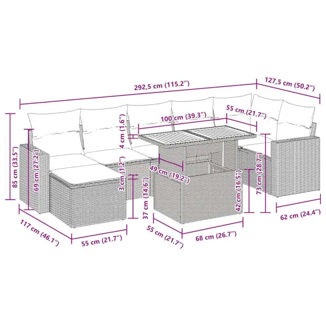 Ta vrtna sedežna garnitura je popoln dodatek za vaše dvorišče, teraso ali verando, saj zagotavlja udoben in vabljiv prostor za klepet z družino in prijatelji ali preprosto za sprostitev in uživanje na prostem. Trpežen material: PE ratan, znan tudi kot poli ratan, je močan sintetični material, ki ne potrebuje vzdrževanja in je videti kot naravni ratan. Je lahek, enostaven za čiščenje in se zaradi svoje vzdržljivosti in odpornosti na vremenske vplive pogosto uporablja za zunanje pohištvo.Funkcija shranjevanja z vodoodporno torbo: Vrtno pohištvo ima pod sedežem prostor za shranjevanje, opremljen z vodoodporno torbo za shranjevanje blazin, igrač in drugih stvari. Notranjo torbo je mogoče varno pritrditi na zunanje pohištvo s kavljem in zanko za večjo stabilnost.Nastavljiva mizna plošča: Z dvigom mizne plošče lahko mizo povišate, s čimer se zunanja klubska mizica spremeni v jedilno mizo. Popolna je za sprejemanje gostov ali uživanje v obrokih na prostem.Prevleko je mogoče odstraniti in oprati: Te sedežne blazine imajo odstranljive prevleke za lažje pranje in vzdrževanje.Modularna zasnova: Ta komplet zunanjega pohištva ima modularno zasnovo, zaradi česar je popolnoma prilagodljiv in enostaven za premikanje, tako da lahko zunanjo garnituro postavite kakor koli želite. Dobro je vedeti:Če želite, da vaše zunanje pohištvo ostane lepo, vam priporočamo, da ga zaščitite z vodoodporno prevleko.Dimenzije vodoodporne vreče: 55 x 53 x 34 cm (D x Š x V)Maksimalna nosilnost (na sedež): 110 kgUV-odpornoPlastične nastavljive nogePotrebno sestavljanje: DaKotni sedež:Barva: BežMaterial: PE ratan, jeklen okvir s prašnim premazomDimenzije: 62 x 62 x 69 cm (Š x G x V)Velikost sedeža: 55 x 55 cm (Š x G)Višina sedeža od tal (brez blazine): 37 cmKotni sedež s naslonom za roke iz ratana:Barva: BežMaterial: PE ratan, jeklen okvir s prašnim premazomDimenzije: 65,5 x 62 x 69 cm (Š x G x V)Velikost sedeža: 55 x 55 cm (Š x G)Višina sedeža od tal (brez blazine): 37 cmVišina naslonjal za roke od tal: 55 cmŠirina naslonjala za roke: 10 cmSrednji sedež:Barva: BežMaterial: PE ratan, jeklen okvir s prašnim premazomDimenzije: 55 x 62 x 69 cm (Š x G x V)Velikost sedeža: 55 x 55 cm (Š x G)Višina sedeža od tal (brez blazine): 37 cmStolček za noge:Barva: BežMaterial: PE ratan, jeklen okvir s prašnim premazomDimenzije: 55 x 55 x 37 cm (Š x G x V)Miza:Barva: BežMaterial: PE ratan, prašno premazano jeklo, trden akacijev les z oljnim premazomDimenzije: 100 x 55 x 44/73 cm (D x Š x V)Blazina:Barva: Kremno belaMaterial prevleke: Tkanina (100 % poliester)Polnilo sedežne blazine: PenaPolnilo hrbtne blazine: bombažna vlaknaDimenzije sedežne blazine: 55 x 55 x 3 cm (Š x G x D)Dimenzije hrbtne blazine: 55 x 45 x 13 cm (D x Š x D)Paket vsebuje:1 x Vrtna miza1 x Kotni kavč s funkcijo shranjevanja z vodoodporno vrečo2 x Kotni sedež z naslonom za roke iz ratana s funkcijo shranjevanja z vodoodporno torbo3 x Srednji kavč s funkcijo shranjevanja z vodoodporno vrečo1 x Stolček za noge s funkcijo shranjevanja z vodoodporno vrečo7 x Hrbtna blazina7 x Sedežna blazina s snemljivo in pralno prevleko 3327068