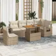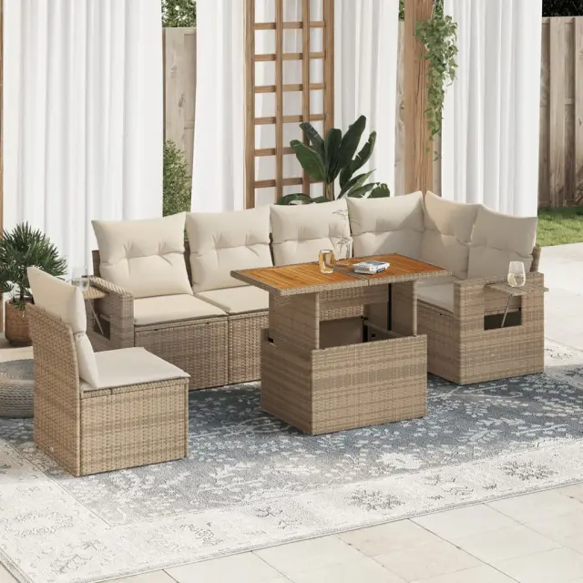 Ta vrtna sedežna garnitura je popoln dodatek za vaše dvorišče, teraso ali verando, saj zagotavlja udoben in vabljiv prostor za klepet z družino in prijatelji ali preprosto za sprostitev in uživanje na prostem. Trpežen material: PE ratan, znan tudi kot poli ratan, je močan sintetični material, ki ne potrebuje vzdrževanja in je videti kot naravni ratan. Je lahek, enostaven za čiščenje in se zaradi svoje vzdržljivosti in odpornosti na vremenske vplive pogosto uporablja za zunanje pohištvo.Funkcija shranjevanja z vodoodporno torbo: Vrtno pohištvo ima pod sedežem prostor za shranjevanje, opremljen z vodoodporno torbo za shranjevanje blazin, igrač in drugih stvari. Notranjo torbo je mogoče varno pritrditi na zunanje pohištvo s kavljem in zanko za večjo stabilnost.Nastavljiva mizna plošča: Z dvigom mizne plošče lahko mizo povišate, s čimer se zunanja klubska mizica spremeni v jedilno mizo. Popolna je za sprejemanje gostov ali uživanje v obrokih na prostem.Prevleko je mogoče odstraniti in oprati: Te sedežne blazine imajo odstranljive prevleke za lažje pranje in vzdrževanje.Modularna zasnova: Ta komplet zunanjega pohištva ima modularno zasnovo, zaradi česar je popolnoma prilagodljiv in enostaven za premikanje, tako da lahko zunanjo garnituro postavite kakor koli želite. Dobro je vedeti:Če želite, da vaše zunanje pohištvo ostane lepo, vam priporočamo, da ga zaščitite z vodoodporno prevleko.Dimenzije vodoodporne vreče: 55 x 53 x 34 cm (D x Š x V)Maksimalna nosilnost (na sedež): 110 kgUV-odpornoPlastične nastavljive nogePotrebno sestavljanje: DaKotni sedež:Barva: BežMaterial: PE ratan, jeklen okvir s prašnim premazomDimenzije: 62 x 62 x 69 cm (Š x G x V)Velikost sedeža: 55 x 55 cm (Š x G)Višina sedeža od tal (brez blazine): 37 cmKotni sedež s naslonom za roke iz ratana:Barva: BežMaterial: PE ratan, jeklen okvir s prašnim premazomDimenzije: 62 x 62 x 69 cm (Š x G x V)Velikost sedeža: 55 x 55 cm (Š x G)Višina sedeža od tal (brez blazine): 37 cmVišina naslonjal za roke od tal: 55 cmŠirina naslonjala za roke: 6 cmVelikost stranske mizice: 25 x 23 cm (D x Š)Srednji sedež:Barva: BežMaterial: PE ratan, jeklen okvir s prašnim premazomDimenzije: 55 x 62 x 69 cm (Š x G x V)Velikost sedeža: 55 x 55 cm (Š x G)Višina sedeža od tal (brez blazine): 37 cmMiza:Barva: BežMaterial: PE ratan, prašno premazano jeklo, trden akacijev les z oljnim premazomDimenzije: 100 x 55 x 44/73 cm (D x Š x V)Blazina:Barva: Kremno belaMaterial prevleke: Tkanina (100 % poliester)Polnilo sedežne blazine: PenaPolnilo hrbtne blazine: bombažna vlaknaDimenzije sedežne blazine: 55 x 55 x 3 cm (Š x G x D)Dimenzije hrbtne blazine: 55 x 45 x 13 cm (D x Š x D)Paket vsebuje:1 x Vrtna miza1 x Kotni kavč s funkcijo shranjevanja z vodoodporno vrečo2 x Kotni sedež z naslonom za roke iz ratana s funkcijo shranjevanja z vodoodporno torbo3 x Srednji kavč s funkcijo shranjevanja z vodoodporno vrečo7 x Hrbtna blazina6 x Sedežna blazina s snemljivo pralno prevleko 3327159
