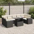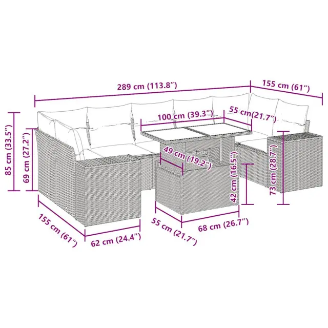 Ta vrtna sedežna garnitura je popoln dodatek za vaše dvorišče, teraso ali verando, saj zagotavlja udoben in vabljiv prostor za klepet z družino in prijatelji ali preprosto za sprostitev in uživanje na prostem. Trpežen material: PE ratan, znan tudi kot poli ratan, je močan sintetični material, ki ne potrebuje vzdrževanja in je videti kot naravni ratan. Je lahek, enostaven za čiščenje in se zaradi svoje vzdržljivosti in odpornosti na vremenske vplive pogosto uporablja za zunanje pohištvo.Funkcija shranjevanja z vodoodporno torbo: Vrtno pohištvo ima pod sedežem prostor za shranjevanje, opremljen z vodoodporno torbo za shranjevanje blazin, igrač in drugih stvari. Notranjo torbo je mogoče varno pritrditi na zunanje pohištvo s kavljem in zanko za večjo stabilnost.Nastavljiva mizna plošča: Z dvigom mizne plošče lahko mizo povišate, s čimer se zunanja klubska mizica spremeni v jedilno mizo. Popolna je za sprejemanje gostov ali uživanje v obrokih na prostem.Prevleko je mogoče odstraniti in oprati: Te sedežne blazine imajo odstranljive prevleke za lažje pranje in vzdrževanje.Modularna zasnova: Ta komplet zunanjega pohištva ima modularno zasnovo, zaradi česar je popolnoma prilagodljiv in enostaven za premikanje, tako da lahko zunanjo garnituro postavite kakor koli želite. Dobro je vedeti:Če želite, da vaše zunanje pohištvo ostane lepo, vam priporočamo, da ga zaščitite z vodoodporno prevleko.Dimenzije vodoodporne vreče: 55 x 53 x 34 cm (D x Š x V)Maksimalna nosilnost (na sedež): 110 kgUV-odpornoPlastične nastavljive nogePotrebno sestavljanje: DaKotni sedež:Barva: ČrnaMaterial: PE ratan, jeklen okvir s prašnim premazomDimenzije: 62 x 62 x 69 cm (Š x G x V)Velikost sedeža: 55 x 55 cm (Š x G)Višina sedeža od tal (brez blazine): 37 cmKotni sedež s naslonom za roke iz ratana:Barva: ČrnaMaterial: PE ratan, jeklen okvir s prašnim premazomDimenzije: 83 x 62 x 69 cm (Š x G x V)Velikost sedeža: 55 x 55 cm (Š x G)Višina sedeža od tal (brez blazine): 37 cmVišina naslonjal za roke od tal: 55 cmŠirina naslona za roke: 27,5 cmSrednji sedež:Barva: ČrnaMaterial: PE ratan, jeklen okvir s prašnim premazomDimenzije: 55 x 62 x 69 cm (Š x G x V)Velikost sedeža: 55 x 55 cm (Š x G)Višina sedeža od tal (brez blazine): 37 cmMiza:Barva: ČrnaMaterial: PE ratan, jeklo s prašnim premazom, kaljeno stekloDimenzije: 100 x 55 x 44/73 cm (D x Š x V)Blazina:Barva: Kremno belaMaterial prevleke: Tkanina (100 % poliester)Polnilo sedežne blazine: PenaPolnilo hrbtne blazine: bombažna vlaknaDimenzije sedežne blazine: 55 x 55 x 3 cm (Š x G x D)Dimenzije hrbtne blazine: 55 x 45 x 13 cm (D x Š x D)Paket vsebuje:1 x Vrtna miza2 x Kotni kavč s funkcijo shranjevanja z vodoodporno vrečo2 x Kotni sedež z naslonom za roke iz ratana s funkcijo shranjevanja z vodoodporno torbo3 x Srednji kavč s funkcijo shranjevanja z vodoodporno vrečo9 x Blazina za hrbet7 x Sedežna blazina s snemljivo in pralno prevleko 3326757