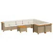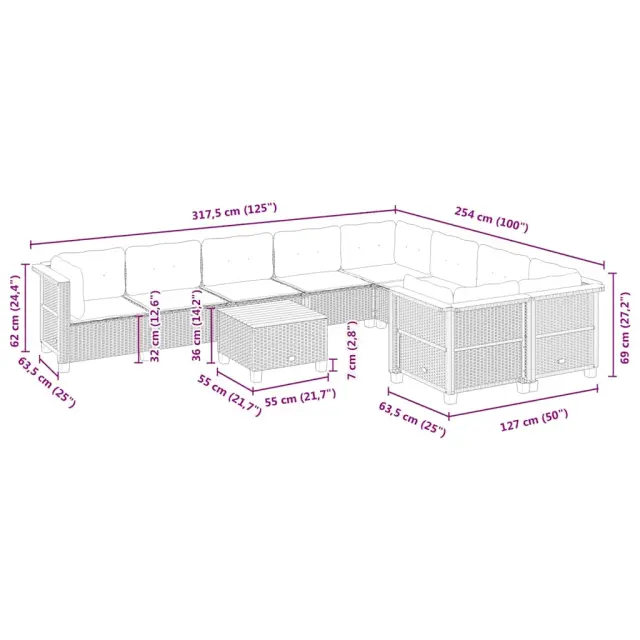 Ta vrtna sedežna garnitura je popoln dodatek za vaše dvorišče, teraso ali verando, saj zagotavlja udoben in vabljiv prostor za klepet z družino in prijatelji ali preprosto za sprostitev in uživanje na prostem. Vzdržljiv material: PE ratan, znan tudi kot poli ratan, je močan sintetični material, ki zahteva malo vzdrževanja in je videti kot naravni ratan. Je lahek, enostaven za čiščenje in se zaradi svoje vzdržljivosti in odpornosti na vremenske vplive pogosto uporablja za zunanje pohištvo.Udobno sedenje: To zunanje pohištvo z debelo oblazinjenimi blazinami zagotavlja udobno sedenje.Prevleko je mogoče odstraniti in oprati: Te sedežne blazine imajo odstranljive prevleke za lažje pranje in vzdrževanje.Stabilna mizna plošča, ki je enostavna za čiščenje: Ta vrtna miza ima ploščo iz akacijevega lesa, ki je čvrsta, vzdržljiva in jo je enostavno čistiti z vlažno krpo.Modularna zasnova: Ta komplet zunanjega pohištva ima modularno zasnovo, zaradi česar je popolnoma prilagodljiv in enostaven za premikanje, tako da lahko zunanjo garnituro postavite kakor koli želite. Dobro je vedeti:Če želite, da vaše zunanje pohištvo ostane lepo, vam priporočamo, da ga zaščitite z vodoodporno prevleko.Maksimalna nosilnost (na sedež): 110 kgUV-odpornoLesene nogePotrebno sestavljanje: DaKotni sedež:Barva: BežMaterial: PE ratan, jeklo s prašnim premazom, trden akacijev les z naravnim oljnim premazomDimenzije: 63,5 x 63,5 x 62 cm (Š x G x V)Velikost sedeža: 56 x 56 cm (Š x G)Višina sedeža, merjena od tal (brez blazine): 32 cmSrednji sedež:Barva: BežMaterial: PE ratan, jeklo s prašnim premazom, trden akacijev les z naravnim oljnim premazomDimenzije: 63,5 x 63,5 x 62 cm (Š x G x V)Velikost sedišča: 63 x 56 cm (Š x G)Višina sedeža, merjena od tal (brez blazine): 32 cmMiza:Barva: BežMaterial: PE ratan, jeklo s prašnim premazom, trden akacijev les z naravnim oljnim premazomDimenzije: 55 x 55 x 36 cm (D x Š x V)Blazina:Barva: Kremno belaMaterial prevleke: Tkanina (100 % poliester)Polnilo sedežne blazine: PenaPolnilo hrbtne blazine: bombažna vlaknaDimenzije sedežne blazine (kotna): 56,5 x 56,5 x 3 cm (Š x G x D)Dimenzije sedežne blazine (sredinska): 63,5 x 56,5 x 3 cm (Š x G x D)Dimenzije hrbtne blazine (kotna): 52 x 35 x 10 cm (D × Š × D)Dimenzije hrbtne blazine (sredinska): 63 x 35 x 10 cm (D x Š x D)Paket vsebuje:4 x Kotni sedež5 x Srednji sedež1 x Vrtna miza13 x Blazina za hrbet9 x Sedežna blazina s snemljivo in pralno prevleko 3262009
