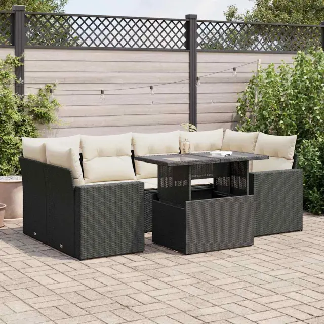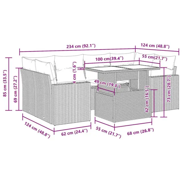 Ta vrtna sedežna garnitura je popoln dodatek za vaše dvorišče, teraso ali verando, saj zagotavlja udoben in vabljiv prostor za klepet z družino in prijatelji ali preprosto za sprostitev in uživanje na prostem. Trpežen material: PE ratan, znan tudi kot poli ratan, je močan sintetični material, ki ne potrebuje vzdrževanja in je videti kot naravni ratan. Je lahek, enostaven za čiščenje in se zaradi svoje vzdržljivosti in odpornosti na vremenske vplive pogosto uporablja za zunanje pohištvo.Funkcija shranjevanja z vodoodporno vrečo: Vsak vrtni sedež ima pod sedežem prostor za shranjevanje, opremljen z vodoodporno vrečo za shranjevanje blazin, igrač in drugih predmetov. Notranja torba ima zgornji pokrov in jo je mogoče varno pritrditi na sedež s kavljem in zanko za večjo stabilnost.Nastavljiva mizna plošča: Z dvigom mizne plošče lahko mizo povišate, s čimer se zunanja klubska mizica spremeni v jedilno mizo. Popolna je za sprejemanje gostov ali uživanje v obrokih na prostem.Prevleko je mogoče odstraniti in oprati: Te sedežne blazine imajo odstranljive prevleke za lažje pranje in vzdrževanje.Robusten in stabilen okvir: Jeklen okvir s prašnim premazom je močan, stabilen, trpežen ter odporen na korozijo in slabe vremenske razmere, kar zagotavlja dolgotrajno delovanje. Dobro je vedeti:Če želite, da vaše zunanje pohištvo ostane lepo, vam priporočamo, da ga zaščitite z vodoodporno prevleko.Dimenzije vodoodporne vreče: 55 x 53 x 34 cm (D x Š x V)Največja dovoljena teža (na sedež): 110 kgUV-odpornoPlastične nastavljive nogePotrebno sestavljanje: DaSrednji sedež:Barva: ČrnaMaterial: PE ratan, jeklen okvir s prašnim premazomDimenzije: 55 x 62 x 69 cm (Š x G x V)Velikost sedeža: 55 x 55 cm (Š x G)Višina sedeža od tal (brez blazine): 37 cmKotni sedež:Barva: ČrnaMaterial: PE ratan, jeklen okvir s prašnim premazomDimenzije: 62 x 62 x 69 cm (Š x G x V)Velikost sedeža: 55 x 55 cm (Š x G)Višina sedeža od tal (brez blazine): 37 cmKavč z naslonjali za roke:Barva: ČrnaMaterial: PE ratan, jeklen okvir s prašnim premazomDimenzije: 65,5 x 62 x 69 cm (Š x G x V)Velikost sedeža: 55 x 55 cm (Š x G)Višina sedeža od tal (brez blazine): 37 cmVišina naslonjal za roke od tal: 55 cmMiza:Barva: ČrnaMaterial: PE ratan, jeklo s prašnim premazom, kaljeno stekloDimenzije: 100 x 55 x 44/73 cm (D x Š x V)Blazina:Barva: Kremno belaMaterial prevleke: Tkanina (100 % poliester)Polnilo sedežne blazine: PenaPolnilo hrbtne blazine: bombažna vlaknaDimenzije sedežne blazine: 55 x 55 x 3 cm (Š x G x D)Dimenzije hrbtne blazine: 55 x 45 x 13 cm (D x Š x D)Paket vsebuje:2 x Srednji kavč s funkcijo shranjevanja z vodoodporno vrečo2 x Kotni kavč s funkcijo shranjevanja z vodoodporno vrečo2 x Kavč s funkcijo shranjevanja z vodoodporno vrečo1 x Miza8 x Blazina za hrbet6 x Sedežna blazina s snemljivo pralno prevleko 3326267