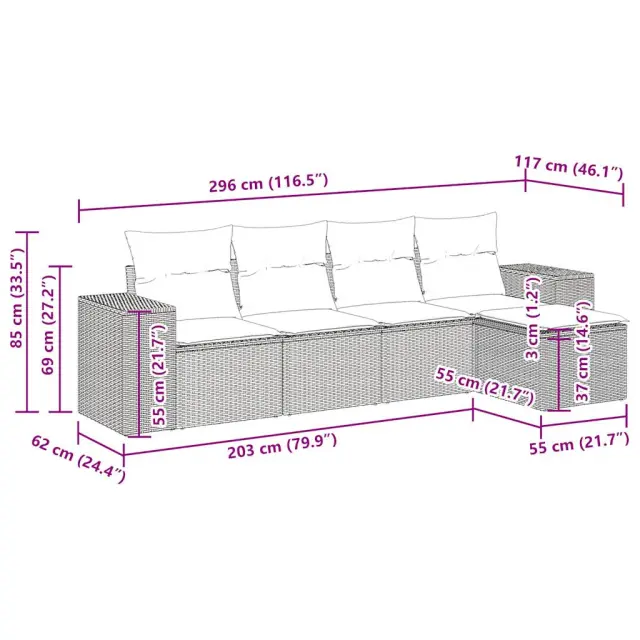 Ta vrtna sedežna garnitura je popoln dodatek za vaše dvorišče, teraso ali verando, saj zagotavlja udoben in vabljiv prostor za klepet z družino in prijatelji ali preprosto za sprostitev in uživanje na prostem. Trpežen material: PE ratan, znan tudi kot poli ratan, je močan sintetični material, ki ne potrebuje vzdrževanja in je videti kot naravni ratan. Je lahek, enostaven za čiščenje in se zaradi svoje vzdržljivosti in odpornosti na vremenske vplive pogosto uporablja za zunanje pohištvo.Funkcija shranjevanja z vodoodporno torbo: Vrtno pohištvo ima pod sedežem prostor za shranjevanje, opremljen z vodoodporno torbo za shranjevanje blazin, igrač in drugih stvari. Notranjo torbo je mogoče varno pritrditi na zunanje pohištvo s kavljem in zanko za večjo stabilnost.Vsestranski stolček za noge: Stolček je vsestransko uporaben, saj služi kot udoben naslon za noge, ko ležite na kavču, ali kot dodaten sedež na vrtu.Prevleko je mogoče odstraniti in oprati: Te sedežne blazine imajo odstranljive prevleke za lažje pranje in vzdrževanje.Modularna zasnova: Ta komplet zunanjega pohištva ima modularno zasnovo, zaradi česar je popolnoma prilagodljiv in enostaven za premikanje, tako da lahko zunanjo garnituro postavite kakor koli želite. Dobro je vedeti:Če želite, da vaše zunanje pohištvo ostane lepo, vam priporočamo, da ga zaščitite z vodoodporno prevleko.Dimenzije vodoodporne vreče: 55 x 53 x 34 cm (D x Š x V)Največja dovoljena teža (na sedež): 110 kgUV-odpornoPlastične nastavljive nogePotrebno sestavljanje: DaKavč z naslonjali za roke:Barva: Svetlo sivaMaterial: PE ratan, jeklen okvir s prašnim premazomDimenzije: 93 x 62 x 69 cm (Š x G x V)Velikost sedeža: 55 x 55 cm (Š x G)Višina sedeža od tal (brez blazine): 37 cmVišina naslonjal za roke od tal: 55 cmŠirina naslona za roke: 27,5 cmSrednji sedež:Barva: Svetlo sivaMaterial: PE ratan, jeklen okvir s prašnim premazomDimenzije: 55 x 62 x 69 cm (Š x G x V)Velikost sedeža: 55 x 55 cm (Š x G)Višina sedeža od tal (brez blazine): 37 cmStolček za noge:Barva: Svetlo sivaMaterial: PE ratan, jeklen okvir s prašnim premazomDimenzije: 55 x 55 x 37 cm (Š x G x V)Blazina:Barva: Temno sivaMaterial prevleke: Tkanina (100 % poliester)Polnilo sedežne blazine: PenaPolnilo hrbtne blazine: bombažna vlaknaDimenzije sedežne blazine: 55 x 55 x 3 cm (Š x G x D)Dimenzije hrbtne blazine: 55 x 45 x 13 cm (D x Š x D)Paket vsebuje:2 x Kavč s funkcijo shranjevanja z vodoodporno vrečo2 x Srednji kavč s funkcijo shranjevanja z vodoodporno vrečo1 x Stolček s funkcijo shranjevanja4 x Blazina za hrbet5 x Sedežna blazina s snemljivo pralno prevleko 3325668