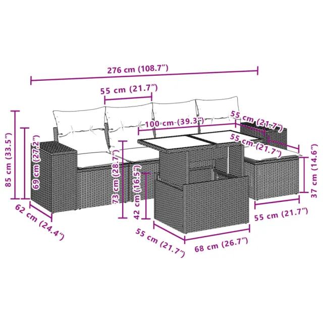 Ta vrtna sedežna garnitura je popoln dodatek za vaše dvorišče, teraso ali verando, saj zagotavlja udoben in vabljiv prostor za klepet z družino in prijatelji ali preprosto za sprostitev in uživanje na prostem. Vzdržljiv material: PE ratan, znan tudi kot poli ratan, je močan sintetični material, ki zahteva malo vzdrževanja in je videti kot naravni ratan. Je lahek, enostaven za čiščenje in se zaradi svoje vzdržljivosti in odpornosti na vremenske vplive pogosto uporablja za zunanje pohištvo.Nastavljiva mizna plošča: Z dvigom mizne plošče lahko mizo povišate, s čimer se zunanja klubska mizica spremeni v jedilno mizo. Popolna je za sprejemanje gostov ali uživanje v obrokih na prostem.Udobno sedenje: To zunanje pohištvo z debelo oblazinjenimi blazinami zagotavlja udobno sedenje.Prevleko je mogoče odstraniti in oprati: Te sedežne blazine imajo odstranljive prevleke za lažje pranje in vzdrževanje.Modularna zasnova: Ta komplet zunanjega pohištva ima modularno zasnovo, zaradi česar je popolnoma prilagodljiv in enostaven za premikanje, tako da lahko zunanjo garnituro postavite kakor koli želite. Dobro je vedeti:Če želite, da vaše zunanje pohištvo ostane lepo, vam priporočamo, da ga zaščitite z vodoodporno prevleko.Maksimalna nosilnost (na sedež): 110 kgUV-odpornoPotrebno sestavljanje: DaSrednji sedež:Barva: RjavaMaterial: PE ratan, jeklen okvir s prašnim premazomDimenzije: 55 x 62 x 69 cm (Š x G x V)Velikost sedeža: 55 x 55 cm (Š x G)Višina sedeža, merjena od tal: 37 cmKavč z naslonjali za roke:Barva: RjavaMaterial: PE ratan, jeklen okvir s prašnim premazomDimenzije: 83 x 62 x 69 cm (Š x G x V)Velikost sedeža: 55 x 55 cm (Š x G)Višina sedeža, merjena od tal: 37 cmVišina naslonjal za roke od tal: 55 cmStolček za noge:Barva: RjavaMaterial: PE ratan, jeklen okvir s prašnim premazomDimenzije: 55 x 55 x 37 cm (Š x G x V)Velikost sedeža: 55 x 55 cm (Š x G)Višina sedeža, merjena od tal: 37 cmMiza:Barva: RjavaMaterial: PE ratan, jeklo s prašnim premazom, kaljeno stekloDimenzije: 100 x 55 x 44/73 cm (D x Š x V)Blazina:Barva: Kremno bela Material prevleke: Tkanina (100 % poliester)Polnilo sedežne blazine: PenaPolnilo hrbtne blazine: bombažna vlaknaDimenzije sedežne blazine: 55 x 55 x 3 cm (Š x G x D)Dimenzije hrbtne blazine: 55 x 45 x 13 cm (D x Š x D)Paket vsebuje:2 x Sredinski sedež2 x Kavč z naslonjali za roke1 x Stolček za noge1 x Vrtna miza4 x Blazina za hrbet5 x Sedežna blazina s snemljivo pralno prevleko 3269133