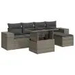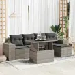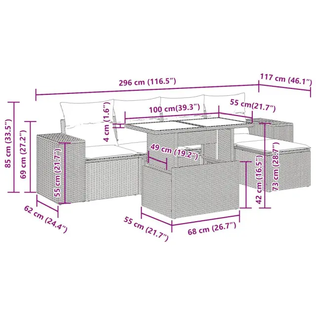 Ta vrtna sedežna garnitura je popoln dodatek za vaše dvorišče, teraso ali verando, saj zagotavlja udoben in vabljiv prostor za klepet z družino in prijatelji ali preprosto za sprostitev in uživanje na prostem. Trpežen material: PE ratan, znan tudi kot poli ratan, je močan sintetični material, ki ne potrebuje vzdrževanja in je videti kot naravni ratan. Je lahek, enostaven za čiščenje in se zaradi svoje vzdržljivosti in odpornosti na vremenske vplive pogosto uporablja za zunanje pohištvo.Funkcija shranjevanja z vodoodporno torbo: Vrtno pohištvo ima pod sedežem prostor za shranjevanje, opremljen z vodoodporno torbo za shranjevanje blazin, igrač in drugih stvari. Notranjo torbo je mogoče varno pritrditi na zunanje pohištvo s kavljem in zanko za večjo stabilnost.Nastavljiva mizna plošča: Z dvigom mizne plošče lahko mizo povišate, s čimer se zunanja klubska mizica spremeni v jedilno mizo. Popolna je za sprejemanje gostov ali uživanje v obrokih na prostem.Prevleko je mogoče odstraniti in oprati: Te sedežne blazine imajo odstranljive prevleke za lažje pranje in vzdrževanje.Modularna zasnova: Ta komplet zunanjega pohištva ima modularno zasnovo, zaradi česar je popolnoma prilagodljiv in enostaven za premikanje, tako da lahko zunanjo garnituro postavite kakor koli želite. Dobro je vedeti:Če želite, da vaše zunanje pohištvo ostane lepo, vam priporočamo, da ga zaščitite z vodoodporno prevleko.Dimenzije vodoodporne vreče: 55 x 53 x 34 cm (D x Š x V)Maksimalna nosilnost (na sedež): 110 kgUV-odpornoPlastične nastavljive nogePotrebno sestavljanje: DaKotni sedež:Barva: SivaMaterial: PE ratan, jeklen okvir s prašnim premazomDimenzije: 83 x 62 x 69 cm (Š x G x V)Velikost sedeža: 55 x 55 cm (Š x G)Višina sedeža od tal (brez blazine): 37 cmVišina naslonjal za roke od tal: 55 cmŠirina naslona za roke: 27,5 cmSrednji sedež:Barva: SivaMaterial: PE ratan, jeklen okvir s prašnim premazomDimenzije: 55 x 62 x 69 cm (Š x G x V)Velikost sedeža: 55 x 55 cm (Š x G)Višina sedeža od tal (brez blazine): 37 cmStolček za noge:Barva: SivaMaterial: PE ratan, jeklen okvir s prašnim premazomDimenzije: 55 x 55 x 37 cm (Š x G x V)Miza:Barva: SivaMaterial: PE ratan, jeklo s prašnim premazom, kaljeno stekloDimenzije: 100 x 55 x 44/73 cm (D x Š x V)Blazina:Barva: Temno sivaMaterial prevleke: Tkanina (100 % poliester)Polnilo sedežne blazine: PenaPolnilo hrbtne blazine: bombažna vlaknaDimenzije sedežne blazine: 55 x 55 x 3 cm (Š x G x D)Dimenzije hrbtne blazine: 55 x 45 x 13 cm (D x Š x D)Paket vsebuje:1 x Vrtna miza2 x Kotni kavč s funkcijo shranjevanja z vodoodporno vrečo2 x Srednji kavč s funkcijo shranjevanja z vodoodporno vrečo1 x Stolček za noge s funkcijo shranjevanja z vodoodporno vrečo4 x Blazina za hrbet5 x Sedežna blazina s snemljivo pralno prevleko 3326781