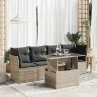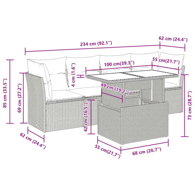 Ta vrtna sedežna garnitura je popoln dodatek za vaše dvorišče, teraso ali verando, saj zagotavlja udoben in vabljiv prostor za klepet z družino in prijatelji ali preprosto za sprostitev in uživanje na prostem. Trpežen material: PE ratan, znan tudi kot poli ratan, je močan sintetični material, ki ne potrebuje vzdrževanja in je videti kot naravni ratan. Je lahek, enostaven za čiščenje in se zaradi svoje vzdržljivosti in odpornosti na vremenske vplive pogosto uporablja za zunanje pohištvo.Funkcija shranjevanja z vodoodporno vrečo: Vsak vrtni sedež ima pod sedežem prostor za shranjevanje, opremljen z vodoodporno vrečo za shranjevanje blazin, igrač in drugih predmetov. Notranja torba ima zgornji pokrov in jo je mogoče varno pritrditi na sedež s kavljem in zanko za večjo stabilnost.Nastavljiva mizna plošča: Z dvigom mizne plošče lahko mizo povišate, s čimer se zunanja klubska mizica spremeni v jedilno mizo. Popolna je za sprejemanje gostov ali uživanje v obrokih na prostem.Prevleko je mogoče odstraniti in oprati: Te sedežne blazine imajo odstranljive prevleke za lažje pranje in vzdrževanje.Robusten in stabilen okvir: Jeklen okvir s prašnim premazom je močan, stabilen, trpežen ter odporen na korozijo in slabe vremenske razmere, kar zagotavlja dolgotrajno delovanje. Dobro je vedeti:Če želite, da vaše zunanje pohištvo ostane lepo, vam priporočamo, da ga zaščitite z vodoodporno prevleko.Dimenzije vodoodporne vreče: 55 x 53 x 34 cm (D x Š x V)Največja dovoljena teža (na sedež): 110 kgUV-odpornoPlastične nastavljive nogePotrebno sestavljanje: DaSrednji sedež:Barva: SivaMaterial: PE ratan, jeklen okvir s prašnim premazomDimenzije: 55 x 62 x 69 cm (Š x G x V)Velikost sedeža: 55 x 55 cm (Š x G)Višina sedeža od tal (brez blazine): 37 cmKotni sedež:Barva: SivaMaterial: PE ratan, jeklen okvir s prašnim premazomDimenzije: 62 x 62 x 69 cm (Š x G x V)Velikost sedeža: 55 x 55 cm (Š x G)Višina sedeža od tal (brez blazine): 37 cmMiza:Barva: SivaMaterial: PE ratan, jeklo s prašnim premazom, kaljeno stekloDimenzije: 100 x 55 x 44/73 cm (D x Š x V)Blazina:Barva: Temno sivaMaterial prevleke: Tkanina (100 % poliester)Polnilo sedežne blazine: PenaPolnilo hrbtne blazine: bombažna vlaknaDimenzije sedežne blazine: 55 x 55 x 3 cm (Š x G x D)Dimenzije hrbtne blazine: 55 x 45 x 13 cm (D x Š x D)Paket vsebuje:2 x Srednji kavč s funkcijo shranjevanja z vodoodporno vrečo2 x Kotni kavč s funkcijo shranjevanja z vodoodporno vrečo1 x Miza6 x Blazina za hrbet4 x Sedežna blazina s snemljivo in pralno prevleko 3326091