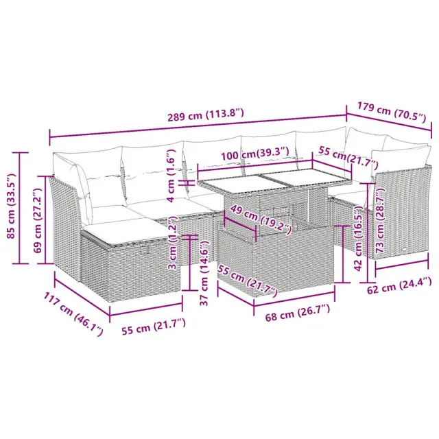 Ta vrtna sedežna garnitura je popoln dodatek za vaše dvorišče, teraso ali verando, saj zagotavlja udoben in vabljiv prostor za klepet z družino in prijatelji ali preprosto za sprostitev in uživanje na prostem.Trpežen material: PE ratan, znan tudi kot poli ratan, je močan sintetični material, ki ne potrebuje vzdrževanja in je videti kot naravni ratan. Je lahek, enostaven za čiščenje in se zaradi svoje vzdržljivosti in odpornosti na vremenske vplive pogosto uporablja za zunanje pohištvo.Funkcija shranjevanja z vodoodporno vrečo: Vsak vrtni sedež ima prostor za shranjevanje pod sedežem, skupaj z vodoodporno vrečo za shranjevanje blazin, igrač in drugih predmetov. Notranje vreče imajo zgornjo prevleko in jih je mogoče s pomočjo primenjal varno pritrditi na sedeže za dodatno varnost.Prevleko je mogoče odstraniti in oprati: Te sedežne blazine imajo odstranljive prevleke za lažje pranje in vzdrževanje.Modularna zasnova: Ta komplet zunanjega pohištva ima modularno zasnovo, zaradi česar je popolnoma prilagodljiv in enostaven za premikanje, tako da lahko zunanjo garnituro postavite kakor koli želite.Dobro je vedeti:Če želite, da vaše zunanje pohištvo ostane lepo, vam priporočamo, da ga zaščitite z vodoodporno prevleko.Največja dovoljena teža (na sedež): 110 kgUV-odpornoPlastične nastavljive nogePotrebno sestavljanje: DaSrednji sedež:Barva: RjavaMaterial: PE ratan, jeklen okvir s prašnim premazomDimenzije: 55 x 62 x 69 cm (Š x G x V)Velikost sedeža: 55 x 55 cm (Š x G)Višina sedeža od tal (brez blazine): 37 cmKotni sedež:Barva: RjavaMaterial: PE ratan, jeklen okvir s prašnim premazomDimenzije: 62 x 62 x 69 cm (Š x G x V)Velikost sedeža: 55 x 55 cm (Š x G)Višina sedeža od tal (brez blazine): 37 cmKotni sedež:Barva: RjavaMaterial: PE ratan, jeklen okvir s prašnim premazomDimenzije: 62 x 62 x 69 cm (Š x G x V)Velikost sedeža: 55 x 55 cm (Š x G)Višina sedeža od tal (brez blazine): 37 cmStolček:Barva: RjavaMaterial: PE ratan, jeklen okvir s prašnim premazomDimenzije: 55 x 55 x 37 cm (Š x G x V)Miza:Barva: RjavaMaterial: PE ratan, jeklo s prašnim premazom, kaljeno stekloDimenzije: 100 x 55 x 44/73 cm (D x Š x V)Blazina:Barva: Kremno belaMaterial prevleke: Tkanina (100 % poliester)Polnilo sedežne blazine: PenaPolnilo hrbtne blazine: bombažna vlaknaDimenzije sedežne blazine: 55 x 55 x 3 cm (Š x G x D)Dimenzije hrbtne blazine: 55 x 45 x 13 cm (D x Š x D)Paket vsebuje:1 x Vrtna miza3 x Kotni kavč s funkcijo shranjevanja z vodoodporno vrečo3 x Srednji kavč s funkcijo shranjevanja z vodoodporno vrečo1 x Stolček s funkcijo shranjevanja z vodoodporno vrečo7 x Sedežna blazina s snemljivo in pralno prevleko9 x Blazina za hrbet 3327793