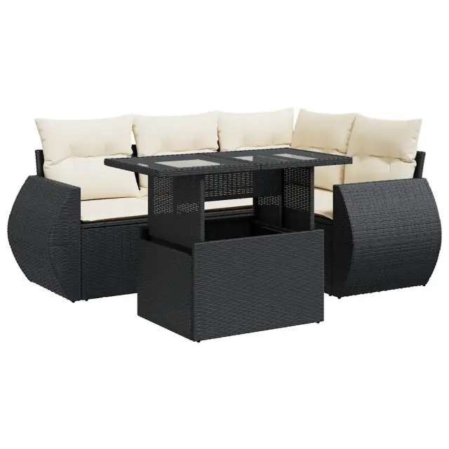 Ta vrtna sedežna garnitura je popoln dodatek za vaše dvorišče, teraso ali verando, saj zagotavlja udoben in vabljiv prostor za klepet z družino in prijatelji ali preprosto za sprostitev in uživanje na prostem. Trpežen material: PE ratan, znan tudi kot poli ratan, je močan sintetični material, ki ne potrebuje vzdrževanja in je videti kot naravni ratan. Je lahek, enostaven za čiščenje in se zaradi svoje vzdržljivosti in odpornosti na vremenske vplive pogosto uporablja za zunanje pohištvo.Funkcija shranjevanja z vodoodporno vrečo: Vsak vrtni sedež ima pod sedežem prostor za shranjevanje, opremljen z vodoodporno vrečo za shranjevanje blazin, igrač in drugih predmetov. Notranja torba ima zgornji pokrov in jo je mogoče varno pritrditi na sedež s kavljem in zanko za večjo stabilnost.Nastavljiva mizna plošča: Z dvigom mizne plošče lahko mizo povišate, s čimer se zunanja klubska mizica spremeni v jedilno mizo. Popolna je za sprejemanje gostov ali uživanje v obrokih na prostem.Prevleko je mogoče odstraniti in oprati: Te sedežne blazine imajo odstranljive prevleke za lažje pranje in vzdrževanje.Robusten in stabilen okvir: Jeklen okvir s prašnim premazom je močan, stabilen, trpežen ter odporen na korozijo in slabe vremenske razmere, kar zagotavlja dolgotrajno delovanje. Dobro je vedeti:Če želite, da vaše zunanje pohištvo ostane lepo, vam priporočamo, da ga zaščitite z vodoodporno prevleko.Dimenzije vodoodporne vreče: 55 x 53 x 34 cm (D x Š x V)Največja dovoljena teža (na sedež): 110 kgUV-odpornoPlastične nastavljive nogePotrebno sestavljanje: DaSrednji sedež:Barva: ČrnaMaterial: PE ratan, jeklen okvir s prašnim premazomDimenzije: 55 x 62 x 69 cm (Š x G x V)Velikost sedeža: 55 x 55 cm (Š x G)Višina sedeža od tal (brez blazine): 37 cmKotni sedež:Barva: ČrnaMaterial: PE ratan, jeklen okvir s prašnim premazomDimenzije: 62 x 62 x 69 cm (Š x G x V)Velikost sedeža: 55 x 55 cm (Š x G)Višina sedeža od tal (brez blazine): 37 cmKavč z naslonjali za roke:Barva: ČrnaMaterial: PE ratan, jeklen okvir s prašnim premazomDimenzije: 71 x 62 x 69 cm (Š x G x V)Velikost sedeža: 55 x 55 cm (Š x G)Višina sedeža od tal (brez blazine): 37 cmVišina naslonjal za roke od tal: 55 cmMiza:Barva: ČrnaMaterial: PE ratan, jeklo s prašnim premazom, kaljeno stekloDimenzije: 100 x 55 x 44/73 cm (D x Š x V)Blazina:Barva: Kremno belaMaterial prevleke: Tkanina (100 % poliester)Polnilo sedežne blazine: PenaPolnilo hrbtne blazine: bombažna vlaknaDimenzije sedežne blazine: 55 x 55 x 3 cm (Š x G x D)Dimenzije hrbtne blazine: 55 x 45 x 13 cm (D x Š x D)Paket vsebuje:1 x Srednji kavč s funkcijo shranjevanja z vodoodporno vrečo1 x Kotni kavč s funkcijo shranjevanja z vodoodporno vrečo2 x Kavč s funkcijo shranjevanja z vodoodporno vrečo1 x Miza5 x Blazina za hrbet4 x Sedežna blazina s snemljivo in pralno prevleko 3326627