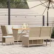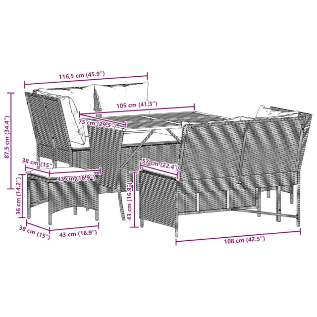 Ta vrtna sedežna garnitura je popoln dodatek za vaše dvorišče, teraso ali verando, saj zagotavlja udoben in vabljiv prostor za klepet z družino in prijatelji ali preprosto za sprostitev in uživanje na prostem. Trpežen material: PE ratan, znan tudi kot poli ratan, je močan sintetični material, ki ne potrebuje vzdrževanja in je videti kot naravni ratan. Je lahek, enostaven za čiščenje in se zaradi svoje vzdržljivosti in odpornosti na vremenske vplive pogosto uporablja za zunanje pohištvo.Stabilna mizna plošča, ki je enostavna za čiščenje: Ta vrtna miza ima ploščo iz akacijevega lesa, ki je čvrsta, vzdržljiva in jo je enostavno čistiti z vlažno krpo.Udobno sedenje: To zunanje pohištvo z debelo oblazinjenimi blazinami zagotavlja udobno sedenje.Vsestranski stolček za noge: Stolček je vsestransko uporaben, saj služi kot udoben naslon za noge, ko ležite na kavču, ali kot dodaten sedež na vrtu.Prevleko je mogoče odstraniti in oprati: Te sedežne blazine imajo odstranljive prevleke za lažje pranje in vzdrževanje. Dobro je vedeti:Če želite, da vaše zunanje pohištvo ostane lepo, vam priporočamo, da ga zaščitite z vodoodporno prevleko.Največja dovoljena teža (na sedež): 110 kgUV-odpornoPotrebno sestavljanje: DaKavč:Barva: BežMaterial: PE ratan, jeklen okvir s prašnim premazomDimenzije (vsaka): 116,5 x 68,5 x 87,5 cm (Š x G x D)Velikost sedeža: 106 x 57 cm (Š x G)Višina sedeža od tal (brez blazine): 43 cmVišina naslona za roke od tal: 87,5 cmStolček:Barva: BežMaterial: PE ratan, jeklen okvir s prašnim premazomDimenzije: 43 x 38 x 36 cm (Š x G x V)Višina sedeža, od tal (brez blazine): 36 cmMiza:Barva: BežMaterial: PE ratan, prašno premazano jeklo, trden akacijev les z oljnim premazomDimenzije: 105 x 75 x 72 cm (D x Š x V)Blazina:Barva: Kremno belaMaterial prevleke: Tkanina (100 % poliester)Polnilo sedežne blazine: PenaMaterial za polnjenje hrbtne blazine Material: vlakna PPDimenzije sedežne blazine: 106 x 59 x 3 cm (Š x G x D)Dimenzije blazine za hrbet: 53 x 43 x 12 cm (D x Š x D)Dimenzije sedežne blazine stolčka: 43 x 38 x 3 cm (Š x G x D)Paket vsebuje:1 x Vrtna miza2 x Kotni sedež2 x Vrtni stolček6 x Hrbtna blazina s snemljivo in pralno prevleko2 x Sedežna blazina s snemljivo pralno prevleko2 x Sedežna blazina za stolček s snemljivo in pralno prevleko 3365347