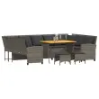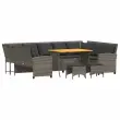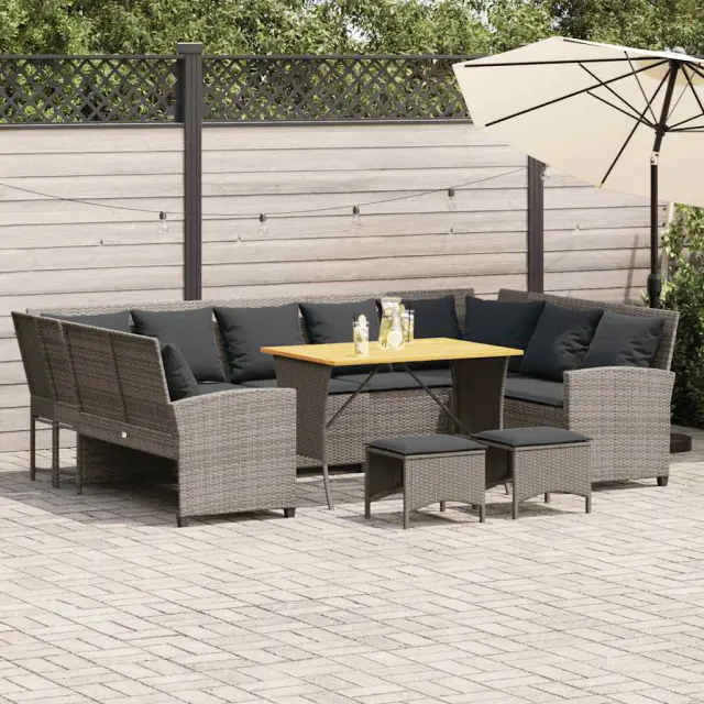 Ta vrtna sedežna garnitura je popoln dodatek za vaše dvorišče, teraso ali verando, saj zagotavlja udoben in vabljiv prostor za klepet z družino in prijatelji ali preprosto za sprostitev in uživanje na prostem. Trpežen material: PE ratan, znan tudi kot poli ratan, je močan sintetični material, ki ne potrebuje vzdrževanja in je videti kot naravni ratan. Je lahek, enostaven za čiščenje in se zaradi svoje vzdržljivosti in odpornosti na vremenske vplive pogosto uporablja za zunanje pohištvo.Stabilna mizna plošča, ki je enostavna za čiščenje: Ta vrtna miza ima ploščo iz akacijevega lesa, ki je čvrsta, vzdržljiva in jo je enostavno čistiti z vlažno krpo.Udobno sedenje: To zunanje pohištvo z debelo oblazinjenimi blazinami zagotavlja udobno sedenje.Vsestranski stolček za noge: Stolček je vsestransko uporaben, saj služi kot udoben naslon za noge, ko ležite na kavču, ali kot dodaten sedež na vrtu.Prevleko je mogoče odstraniti in oprati: Te sedežne blazine imajo odstranljive prevleke za lažje pranje in vzdrževanje. Dobro je vedeti:Če želite, da vaše zunanje pohištvo ostane lepo, vam priporočamo, da ga zaščitite z vodoodporno prevleko.Maks. nosilnost (na sedež): 110 kgUV-odpornoPotrebno sestavljanje: DaVrtni kavč:Barva: SivaMaterial: PE ratan, jeklen okvir s prašnim premazomCelotne dimenzije: 288 x 181 x 87,5 cm (Š x G x V)Širina sedeža: 267 cmGlobina sedeža: 57 cmVišina sedeža od tal (brez blazine): 43 cmVišina naslonjala za roke, merjena od tal: 61 cmStolček:Barva: SivaMaterial: PE ratan, jeklen okvir s prašnim premazomDimenzije: 43 x 38 x 36 cm (Š x G x V)Višina sedeža, od tal (brez blazine): 36 cmMiza:Barva: SivaMaterial: PE ratan, jeklo s prašnim premazom, trden akacijev les z naravnim oljnim premazomDimenzije: 105 x 75 x 72 cm (D x Š x V)Blazina:Barva: Temno sivaMaterial prevleke: Tkanina (100 % poliester)Material za polnjenje hrbtne blazine Material: vlakna PPPolnilo sedežne blazine: PenaDimenzije sedežne blazine (L): 106 x 57 x 3 cm (Š x G x D)Dimenzije sedežne blazine (S): 55 x 57 x 3 cm (Š x G x D)Dimenzije blazine za hrbet: 53 x 43 x 12 cm (D x Š x D)Dimenzije sedežne blazine stolčka: 43 x 38 x 3 cm (Š x G x D)Paket vsebuje:1 x Vrtna miza1 x Vrtni kavč2 x Vrtni stolček4 x sedežna blazina s snemljivo in pralno prevleko (L)1 x sedežna blazina s snemljivo in pralno prevleko (S)11 x Hrbtna blazina s snemljivo in pralno prevleko2 x Sedežna blazina za stolček s snemljivo in pralno prevleko 3365339