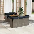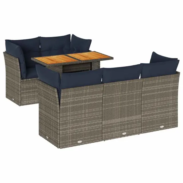 Ta vrtna sedežna garnitura je popoln dodatek za vaše dvorišče, teraso ali verando, saj zagotavlja udoben in vabljiv prostor za klepet z družino in prijatelji ali preprosto za sprostitev in uživanje na prostem. Trpežen material: PE ratan, znan tudi kot poli ratan, je močan sintetični material, ki ne potrebuje vzdrževanja in je videti kot naravni ratan. Je lahek, enostaven za čiščenje in se zaradi svoje vzdržljivosti in odpornosti na vremenske vplive pogosto uporablja za zunanje pohištvo.Funkcija shranjevanja z vodoodporno vrečo: Vsak vrtni sedež ima pod sedežem prostor za shranjevanje, opremljen z vodoodporno vrečo za shranjevanje blazin, igrač in drugih predmetov. Notranja torba ima zgornji pokrov in jo je mogoče varno pritrditi na sedež s kavljem in zanko za večjo stabilnost.Nastavljiva mizna plošča: Z dvigom mizne plošče lahko mizo povišate, s čimer se zunanja klubska mizica spremeni v jedilno mizo. Popolna je za sprejemanje gostov ali uživanje v obrokih na prostem.Prevleko je mogoče odstraniti in oprati: Te sedežne blazine imajo odstranljive prevleke za lažje pranje in vzdrževanje.Robusten in stabilen okvir: Jeklen okvir s prašnim premazom je močan, stabilen, trpežen ter odporen na korozijo in slabe vremenske razmere, kar zagotavlja dolgotrajno delovanje. Dobro je vedeti:Če želite, da vaše zunanje pohištvo ostane lepo, vam priporočamo, da ga zaščitite z vodoodporno prevleko.Dimenzije vodoodporne vreče: 55 x 53 x 34 cm (D x Š x V)Največja dovoljena teža (na sedež): 110 kgUV-odpornoPlastične nastavljive nogePotrebno sestavljanje: DaSrednji sedež:Barva: SivaMaterial: PE ratan, jeklen okvir s prašnim premazomDimenzije: 55 x 62 x 69 cm (Š x G x V)Velikost sedeža: 55 x 55 cm (Š x G)Višina sedeža od tal (brez blazine): 37 cmKotni sedež:Barva: SivaMaterial: PE ratan, jeklen okvir s prašnim premazomDimenzije: 62 x 62 x 69 cm (Š x G x V)Velikost sedeža: 55 x 55 cm (Š x G)Višina sedeža od tal (brez blazine): 37 cmMiza:Barva: SivaMaterial: PE ratan, prašno premazano jeklo, trden akacijev les z oljnim premazomDimenzije: 100 x 55 x 44/73 cm (D x Š x V)Blazina:Barva: Mornarsko modraMaterial prevleke: Tkanina (100 % poliester)Polnilo sedežne blazine: PenaPolnilo hrbtne blazine: bombažna vlaknaDimenzije sedežne blazine: 55 x 55 x 3 cm (Š x G x D)Dimenzije hrbtne blazine: 55 x 45 x 13 cm (D x Š x D)Paket vsebuje:1 x Srednji kavč s funkcijo shranjevanja z vodoodporno vrečo4 x Kotni sedež s funkcijo shranjevanja z vodoodporno vrečo1 x Miza9 x Blazina za hrbet5 x Sedežna blazina s snemljivo pralno prevleko 3326889