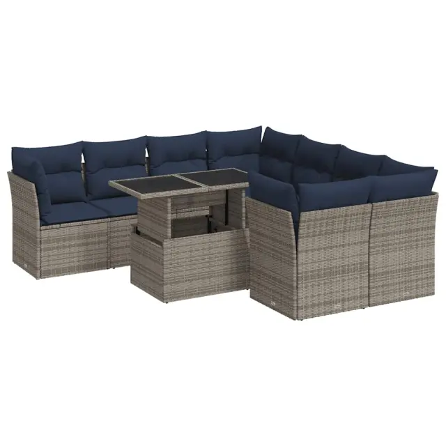 Ta vrtna sedežna garnitura je popoln dodatek za vaše dvorišče, teraso ali verando, saj zagotavlja udoben in vabljiv prostor za klepet z družino in prijatelji ali preprosto za sprostitev in uživanje na prostem.Trpežen material: PE ratan, znan tudi kot poli ratan, je močan sintetični material, ki ne potrebuje vzdrževanja in je videti kot naravni ratan. Je lahek, enostaven za čiščenje in se zaradi svoje vzdržljivosti in odpornosti na vremenske vplive pogosto uporablja za zunanje pohištvo.Funkcija shranjevanja z vodoodporno vrečo: Vsak vrtni sedež ima prostor za shranjevanje pod sedežem, skupaj z vodoodporno vrečo za shranjevanje blazin, igrač in drugih predmetov. Notranje vreče imajo zgornjo prevleko in jih je mogoče s pomočjo primenjal varno pritrditi na sedeže za dodatno varnost.Prevleko je mogoče odstraniti in oprati: Te sedežne blazine imajo odstranljive prevleke za lažje pranje in vzdrževanje.Modularna zasnova: Ta komplet zunanjega pohištva ima modularno zasnovo, zaradi česar je popolnoma prilagodljiv in enostaven za premikanje, tako da lahko zunanjo garnituro postavite kakor koli želite.Dobro je vedeti:Če želite, da vaše zunanje pohištvo ostane lepo, vam priporočamo, da ga zaščitite z vodoodporno prevleko.Maksimalna nosilnost (na sedež): 110 kgUV-odpornoPlastične nastavljive nogePotrebno sestavljanje: DaKotni sedež:Barva: SivaMaterial: PE ratan, jeklen okvir s prašnim premazomDimenzije: 62 x 62 x 69 cm (Š x G x V)Velikost sedeža: 55 x 55 cm (Š x G)Višina sedeža od tal (brez blazine): 37 cmSrednji sedež:Barva: SivaMaterial: PE ratan, jeklen okvir s prašnim premazomDimenzije: 55 x 62 x 69 cm (Š x G x V)Velikost sedeža: 55 x 55 cm (Š x G)Višina sedeža od tal (brez blazine): 37 cmMiza:Barva: SivaMaterial: PE ratan, jeklo s prašnim premazom, kaljeno stekloDimenzije: 100 x 55 x 44/73 cm (D x Š x V)Blazina:Barva: Mornarsko modraMaterial prevleke: Tkanina (100 % poliester)Polnilo sedežne blazine: PenaPolnilo hrbtne blazine: bombažna vlaknaDimenzije sedežne blazine: 55 x 55 x 3 cm (Š x G x D)Dimenzije hrbtne blazine: 55 x 45 x 13 cm (D x Š x D)Paket vsebuje:1 x Vrtna miza4 x Kotni sedež s funkcijo shranjevanja z vodoodporno vrečo4 x Srednji kavč s funkcijo shranjevanja z vodoodporno vrečo8 x Sedežna blazina s snemljivo in pralno prevleko12 x Blazina za hrbet 3326132
