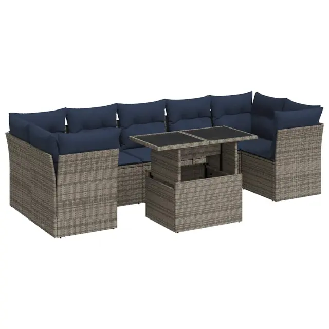 Ta vrtna sedežna garnitura je popoln dodatek za vaše dvorišče, teraso ali verando, saj zagotavlja udoben in vabljiv prostor za klepet z družino in prijatelji ali preprosto za sprostitev in uživanje na prostem.Trpežen material: PE ratan, znan tudi kot poli ratan, je močan sintetični material, ki ne potrebuje vzdrževanja in je videti kot naravni ratan. Je lahek, enostaven za čiščenje in se zaradi svoje vzdržljivosti in odpornosti na vremenske vplive pogosto uporablja za zunanje pohištvo.Funkcija shranjevanja z vodoodporno vrečo: Vsak vrtni sedež ima prostor za shranjevanje pod sedežem, skupaj z vodoodporno vrečo za shranjevanje blazin, igrač in drugih predmetov. Notranje vreče imajo zgornjo prevleko in jih je mogoče s pomočjo primenjal varno pritrditi na sedeže za dodatno varnost.Prevleko je mogoče odstraniti in oprati: Te sedežne blazine imajo odstranljive prevleke za lažje pranje in vzdrževanje.Modularna zasnova: Ta komplet zunanjega pohištva ima modularno zasnovo, zaradi česar je popolnoma prilagodljiv in enostaven za premikanje, tako da lahko zunanjo garnituro postavite kakor koli želite.Dobro je vedeti:Če želite, da vaše zunanje pohištvo ostane lepo, vam priporočamo, da ga zaščitite z vodoodporno prevleko.Maksimalna nosilnost (na sedež): 110 kgUV-odpornoPlastične nastavljive nogePotrebno sestavljanje: DaKotni sedež:Barva: SivaMaterial: PE ratan, jeklen okvir s prašnim premazomDimenzije: 62 x 62 x 69 cm (Š x G x V)Velikost sedeža: 55 x 55 cm (Š x G)Višina sedeža od tal (brez blazine): 37 cmSrednji sedež:Barva: SivaMaterial: PE ratan, jeklen okvir s prašnim premazomDimenzije: 55 x 62 x 69 cm (Š x G x V)Velikost sedeža: 55 x 55 cm (Š x G)Višina sedeža od tal (brez blazine): 37 cmMiza:Barva: SivaMaterial: PE ratan, jeklo s prašnim premazom, kaljeno stekloDimenzije: 100 x 55 x 44/73 cm (D x Š x V)Blazina:Barva: Mornarsko modraMaterial prevleke: Tkanina (100 % poliester)Polnilo sedežne blazine: PenaPolnilo hrbtne blazine: bombažna vlaknaDimenzije sedežne blazine: 55 x 55 x 3 cm (Š x G x D)Dimenzije hrbtne blazine: 55 x 45 x 13 cm (D x Š x D)Paket vsebuje:1 x Vrtna miza4 x Kotni sedež s funkcijo shranjevanja z vodoodporno vrečo3 x Srednji kavč s funkcijo shranjevanja z vodoodporno vrečo7 x Sedežna blazina s snemljivo in pralno prevleko11 x Blazina za hrbet 3326122