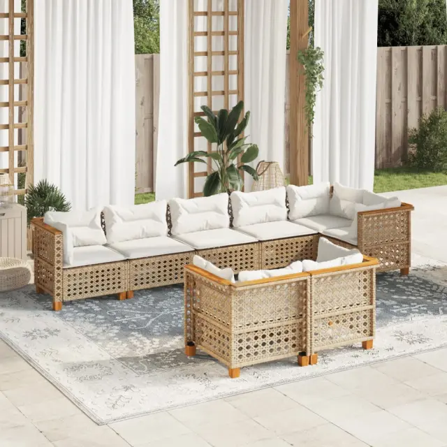 Ta vrtna sedežna garnitura je popoln dodatek za vaše dvorišče, teraso ali verando, saj zagotavlja udoben in vabljiv prostor za klepet z družino in prijatelji ali preprosto za sprostitev in uživanje na prostem. Vzdržljiv material: PE ratan, znan tudi kot poli ratan, je močan sintetični material, ki zahteva malo vzdrževanja in je videti kot naravni ratan. Je lahek, enostaven za čiščenje in se zaradi svoje vzdržljivosti in odpornosti na vremenske vplive pogosto uporablja za zunanje pohištvo.Udobno sedenje: To zunanje pohištvo z debelo oblazinjenimi blazinami zagotavlja udobno sedenje.Prevleko je mogoče odstraniti in oprati: Te sedežne blazine imajo odstranljive prevleke za lažje pranje in vzdrževanje.Modularna zasnova: Ta komplet zunanjega pohištva ima modularno zasnovo, zaradi česar je popolnoma prilagodljiv in enostaven za premikanje, tako da lahko zunanjo garnituro postavite kakor koli želite. Dobro je vedeti:Če želite, da vaše zunanje pohištvo ostane lepo, vam priporočamo, da ga zaščitite z vodoodporno prevleko.Maksimalna nosilnost (na sedež): 110 kgUV-odpornoLesene nogePotrebno sestavljanje: DaKotni sedež:Barva: BežMaterial: PE ratan, jeklo s prašnim premazom, trden akacijev les z naravnim oljnim premazomDimenzije: 63,5 x 63,5 x 62 cm (Š x G x V)Velikost sedeža: 56 x 56 cm (Š x G)Višina sedeža, merjena od tal (brez blazine): 32 cmSrednji sedež:Barva: BežMaterial: PE ratan, jeklo s prašnim premazom, trden akacijev les z naravnim oljnim premazomDimenzije: 63,5 x 63,5 x 62 cm (Š x G x V)Velikost sedišča: 63 x 56 cm (Š x G)Višina sedeža, merjena od tal (brez blazine): 32 cmBlazina:Barva: Kremno belaMaterial prevleke: Tkanina (100 % poliester)Polnilo sedežne blazine: PenaPolnilo hrbtne blazine: bombažna vlaknaDimenzije sedežne blazine (kotna): 56,5 x 56,5 x 3 cm (Š x G x D)Dimenzije sedežne blazine (sredinska): 63,5 x 56,5 x 3 cm (Š x G x D)Dimenzije hrbtne blazine (kotna): 52 x 35 x 10 cm (D × Š × D)Dimenzije hrbtne blazine (sredinska): 63 x 35 x 10 cm (D x Š x D)Paket vsebuje:5 x Kotni sedež3 x Srednji sedež13 x Blazina za hrbet8 x Sedežna blazina s snemljivo in pralno prevleko 3261892