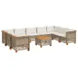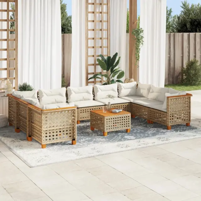 Ta vrtna sedežna garnitura je popoln dodatek za vaše dvorišče, teraso ali verando, saj zagotavlja udoben in vabljiv prostor za klepet z družino in prijatelji ali preprosto za sprostitev in uživanje na prostem. Vzdržljiv material: PE ratan, znan tudi kot poli ratan, je močan sintetični material, ki zahteva malo vzdrževanja in je videti kot naravni ratan. Je lahek, enostaven za čiščenje in se zaradi svoje vzdržljivosti in odpornosti na vremenske vplive pogosto uporablja za zunanje pohištvo.Udobno sedenje: To zunanje pohištvo z debelo oblazinjenimi blazinami zagotavlja udobno sedenje.Prevleko je mogoče odstraniti in oprati: Te sedežne blazine imajo odstranljive prevleke za lažje pranje in vzdrževanje.Stabilna mizna plošča, ki je enostavna za čiščenje: Ta vrtna miza ima ploščo iz akacijevega lesa, ki je čvrsta, vzdržljiva in jo je enostavno čistiti z vlažno krpo.Modularna zasnova: Ta komplet zunanjega pohištva ima modularno zasnovo, zaradi česar je popolnoma prilagodljiv in enostaven za premikanje, tako da lahko zunanjo garnituro postavite kakor koli želite. Dobro je vedeti:Če želite, da vaše zunanje pohištvo ostane lepo, vam priporočamo, da ga zaščitite z vodoodporno prevleko.Maksimalna nosilnost (na sedež): 110 kgUV-odpornoLesene nogePotrebno sestavljanje: DaKotni sedež:Barva: BežMaterial: PE ratan, jeklo s prašnim premazom, trden akacijev les z naravnim oljnim premazomDimenzije: 63,5 x 63,5 x 62 cm (Š x G x V)Velikost sedeža: 56 x 56 cm (Š x G)Višina sedeža, merjena od tal (brez blazine): 32 cmSrednji sedež:Barva: BežMaterial: PE ratan, jeklo s prašnim premazom, trden akacijev les z naravnim oljnim premazomDimenzije: 63,5 x 63,5 x 62 cm (Š x G x V)Velikost sedišča: 63 x 56 cm (Š x G)Višina sedeža, merjena od tal (brez blazine): 32 cmMiza:Barva: BežMaterial: PE ratan, jeklo s prašnim premazom, trden akacijev les z naravnim oljnim premazomDimenzije: 55 x 55 x 36 cm (D x Š x V)Blazina:Barva: Kremno belaMaterial prevleke: Tkanina (100 % poliester)Polnilo sedežne blazine: PenaPolnilo hrbtne blazine: bombažna vlaknaDimenzije sedežne blazine (kotna): 56,5 x 56,5 x 3 cm (Š x G x D)Dimenzije sedežne blazine (sredinska): 63,5 x 56,5 x 3 cm (Š x G x D)Dimenzije hrbtne blazine (kotna): 52 x 35 x 10 cm (D × Š × D)Dimenzije hrbtne blazine (sredinska): 63 x 35 x 10 cm (D x Š x D)Paket vsebuje:4 x Kotni sedež5 x Srednji sedež1 x Vrtna miza13 x Blazina za hrbet9 x Sedežna blazina s snemljivo in pralno prevleko 3261988