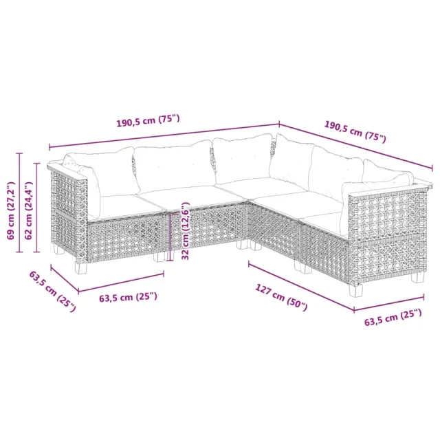 Ta vrtna sedežna garnitura je popoln dodatek za vaše dvorišče, teraso ali verando, saj zagotavlja udoben in vabljiv prostor za klepet z družino in prijatelji ali preprosto za sprostitev in uživanje na prostem. Vzdržljiv material: PE ratan, znan tudi kot poli ratan, je močan sintetični material, ki zahteva malo vzdrževanja in je videti kot naravni ratan. Je lahek, enostaven za čiščenje in se zaradi svoje vzdržljivosti in odpornosti na vremenske vplive pogosto uporablja za zunanje pohištvo.Udobno sedenje: To zunanje pohištvo z debelo oblazinjenimi blazinami zagotavlja udobno sedenje.Prevleko je mogoče odstraniti in oprati: Te sedežne blazine imajo odstranljive prevleke za lažje pranje in vzdrževanje.Modularna zasnova: Ta komplet zunanjega pohištva ima modularno zasnovo, zaradi česar je popolnoma prilagodljiv in enostaven za premikanje, tako da lahko zunanjo garnituro postavite kakor koli želite. Dobro je vedeti:Če želite, da vaše zunanje pohištvo ostane lepo, vam priporočamo, da ga zaščitite z vodoodporno prevleko.Maksimalna nosilnost (na sedež): 110 kgUV-odpornoLesene nogePotrebno sestavljanje: DaKotni sedež:Barva: BežMaterial: PE ratan, jeklo s prašnim premazom, trden akacijev les z naravnim oljnim premazomDimenzije: 63,5 x 63,5 x 62 cm (Š x G x V)Velikost sedeža: 56 x 56 cm (Š x G)Višina sedeža, merjena od tal (brez blazine): 32 cmSrednji sedež:Barva: BežMaterial: PE ratan, jeklo s prašnim premazom, trden akacijev les z naravnim oljnim premazomDimenzije: 63,5 x 63,5 x 62 cm (Š x G x V)Velikost sedišča: 63 x 56 cm (Š x G)Višina sedeža, merjena od tal (brez blazine): 32 cmBlazina:Barva: Kremno belaMaterial prevleke: Tkanina (100 % poliester)Polnilo sedežne blazine: PenaPolnilo hrbtne blazine: bombažna vlaknaDimenzije sedežne blazine (kotna): 56,5 x 56,5 x 3 cm (Š x G x D)Dimenzije sedežne blazine (sredinska): 63,5 x 56,5 x 3 cm (Š x G x D)Dimenzije hrbtne blazine (kotna): 52 x 35 x 10 cm (D × Š × D)Dimenzije hrbtne blazine (sredinska): 63 x 35 x 10 cm (D x Š x D)Paket vsebuje:3 x Kotni kavč2 x Sredinski sedež8 x Blazina za hrbet5 x Sedežna blazina s snemljivo pralno prevleko 3261826